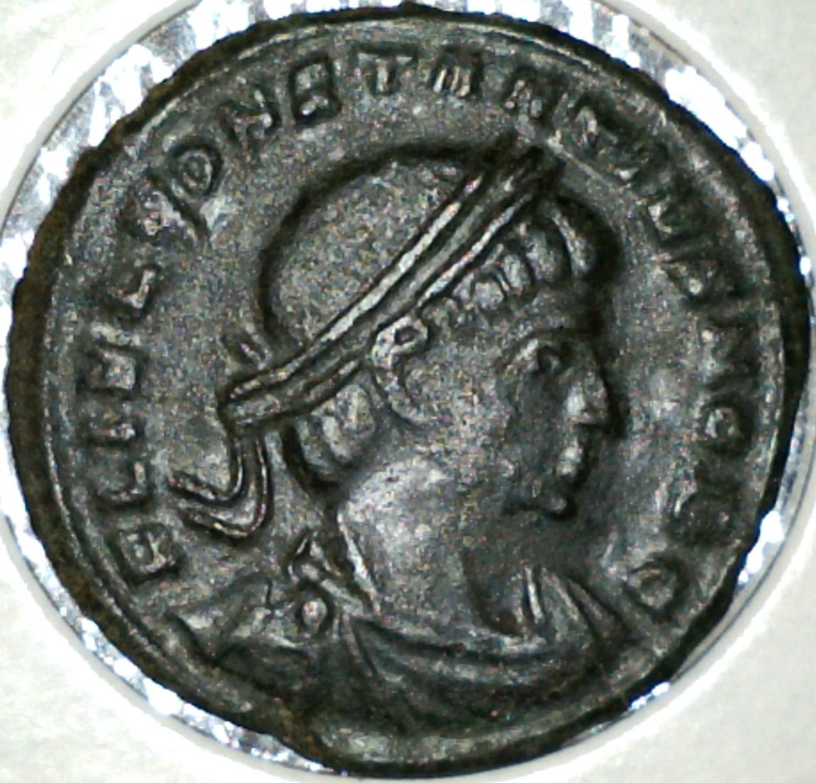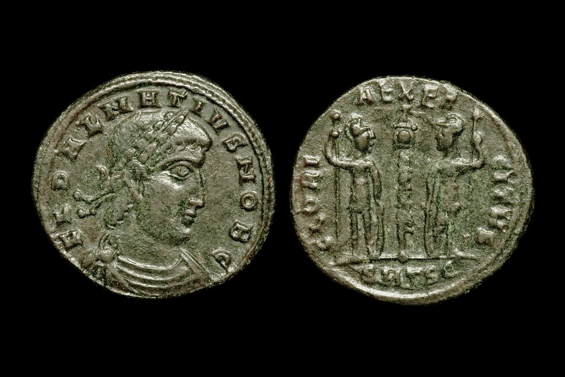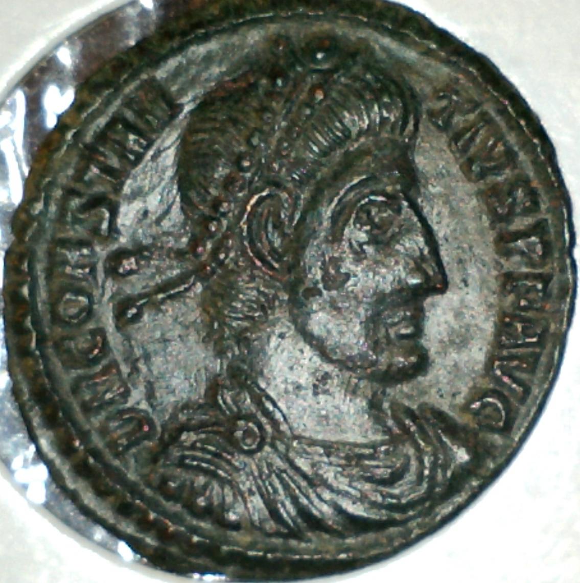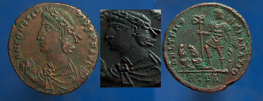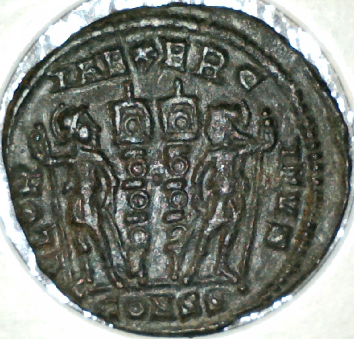 Two Soldiers, two standards. This distinguishes to the design that replaced it where the two soldiers shared one standard (Two soldiers, one standard). Th loss of the second standard marked a considerable reduction in the weight standard of the coins. As an example I'll show a Dalmatius of Thessalonica mint.