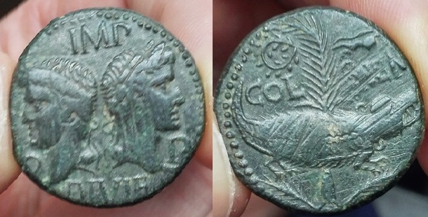 Here is another coin I acquired recently. I know we have discussed these and shown our coins in the not too distant past, but because it's slow, post them again. My new coin is slightly different from the old in that Augustus' head is bare in the old coin while he is laureated on the new. First the new coin: AUGUSTUS AE Dupondius OBVERSE: IMP DIVI F P-P, back-to-back heads of Agrippa, in rostral crown, & Augustus, laureate REVERSE: COL NEM, palm tree curving to left, crocodile right chained below, wreath to left of palm tip with long ties trailing to right Nemausus (Gaul) 20-10 BC 11.97g, 26mm RIC 159 AUGUSTUS AE Dupondius OBVERSE: IMP DIVI F, back-to-back heads of Agrippa, wearing rostral crown, & Augustus, bare REVERSE: COL NEM, crocodile chained to palm, wreath with long ties trailing above. Nemausus (Gaul) 20-10 BC 13.1g, 26mm RIC 155