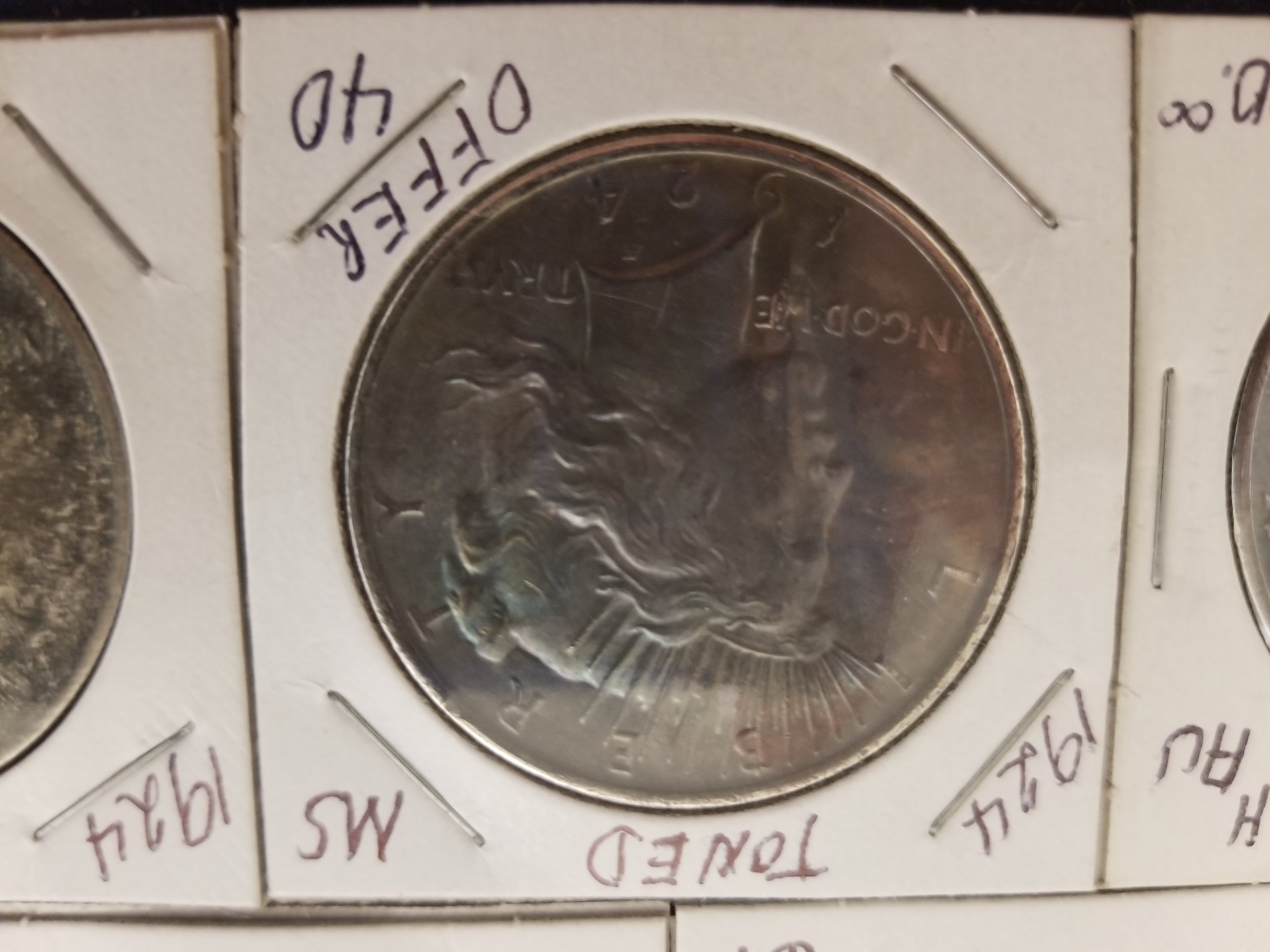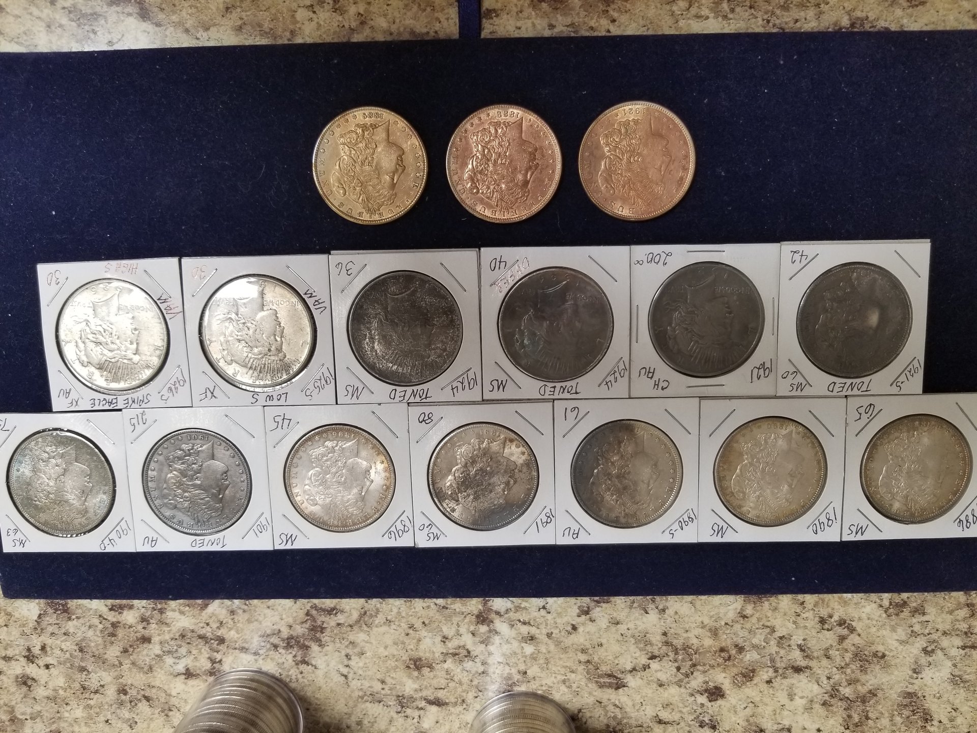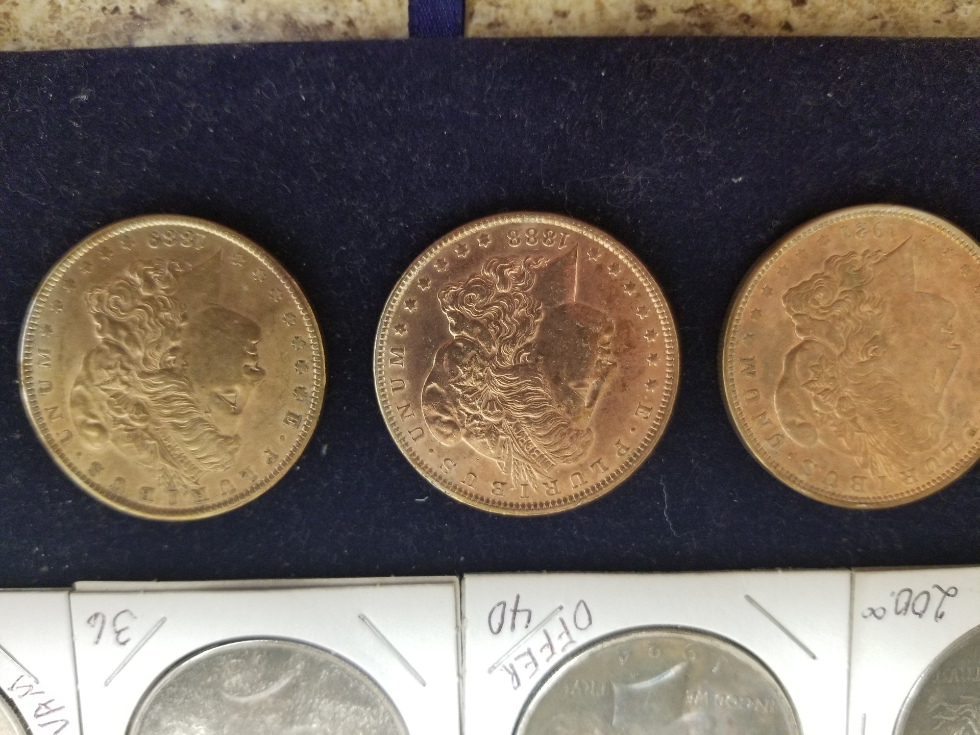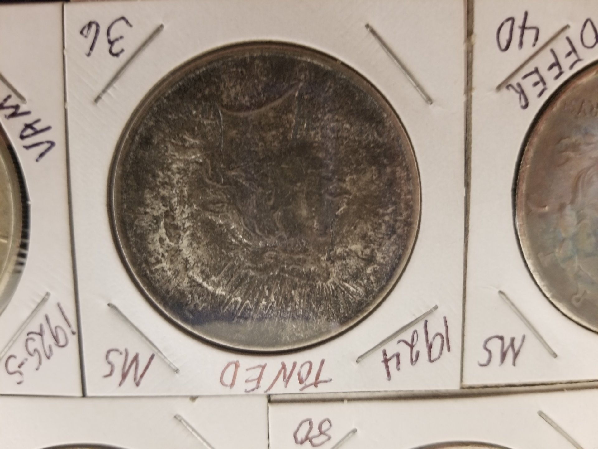There were over 600 silver dollars in the group that were all flood damaged in some way. All were soaked for days in CLR, many were dipped and/or soaked in Tarn-X, many soaked in acetone, all soaked in a pine sol type cleaner, and other chemicals. I was hoping the dealer knew what he used in what order. He did say that he had some copper coins in the CLR at times 20190315_180338.jpg 20190315_180355_001.jpg 20190315_180408_001.jpg 20190315_180441.jpg 20190315_180450.jpg 20190315_180738.jpg 20190315_180742.jpg 20190315_180723.jpg 20190315_180714.jpg 20190315_180746.jpg which may account for the golden toning. There was paint, rust, chemical corrosion, vehicle oils and grease and batteries acid and other material that settled on the coins. Oh, and plenty of mud. Many of the coins were in albums during the flood and the paper was still stuck to them. Most of the coins were sold to a Northeastern PA bullion dealer at the February coin show in Pittston, PA. I do know the golden toned ones were in CLR with copper pennies. I kept about 2 dozen to use in talks at our local coin club meetings about artificial toning. If you go to the Legend Coin auction for the 1924 MS-64 and right click on the obverse image and open in a new tab and then enlarge the image, you will see many problems with the coin. Do the same with the reverse and enlarge and you will see the chemical damage near the words United States Of America. Enlarge "States Of" and the damage is more prevalent. Just think PCGS got it right with Questionable Toning. Then they changed their mind. Hmm, buy the coin, not the Holder. I would enjoy doing a forensic diagnostic analysis on this coin in hand.