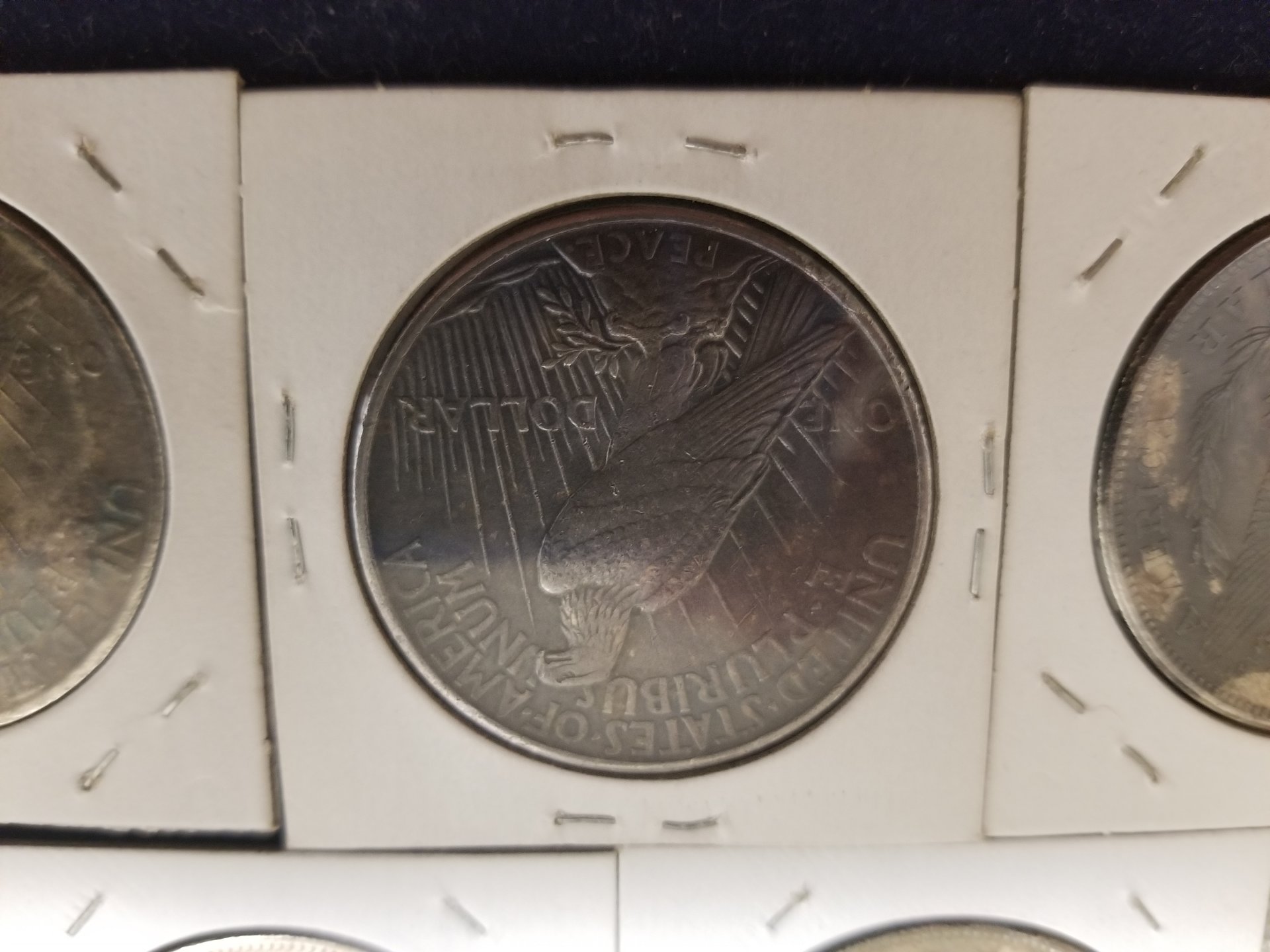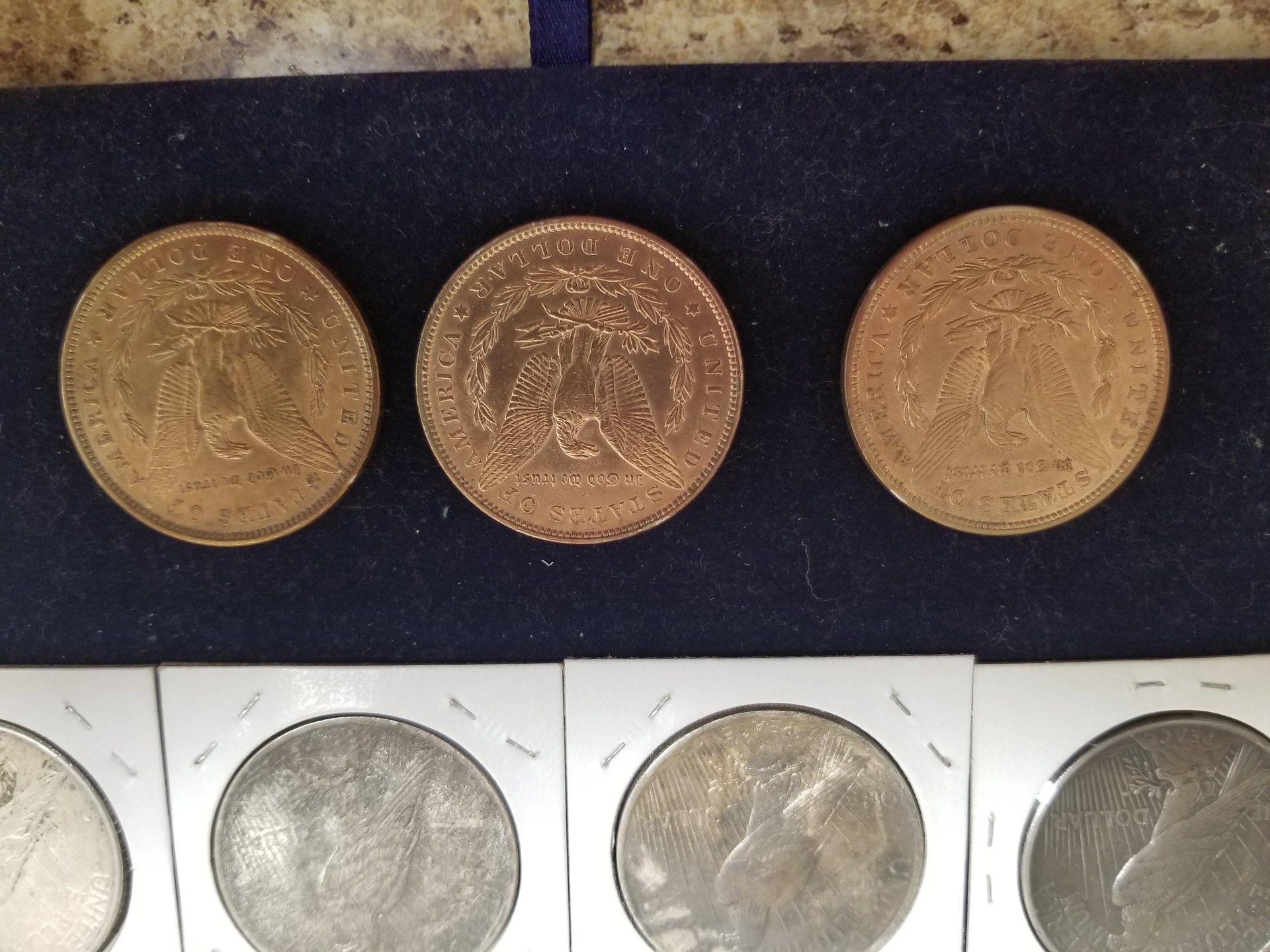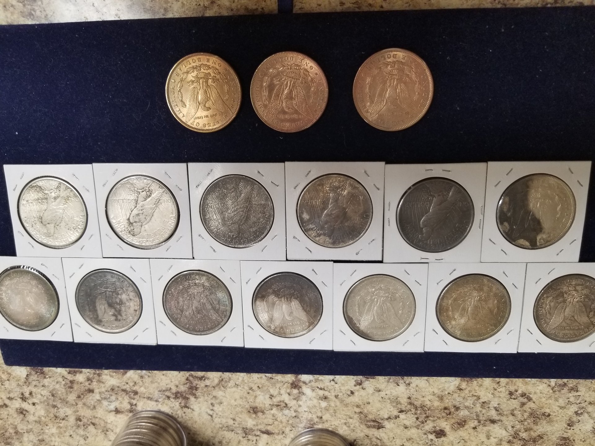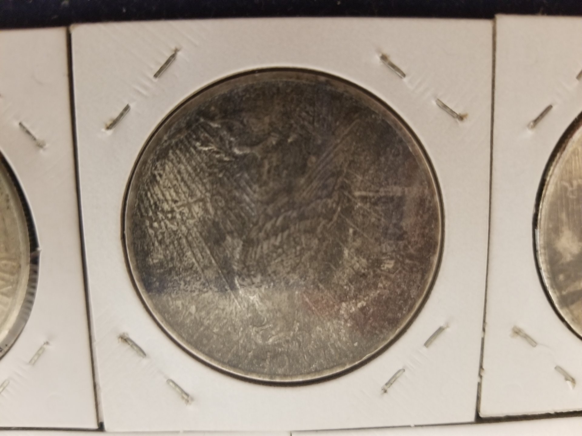 There were over 600 silver dollars in the group that were all flood damaged in some way. All were soaked for days in CLR, many were dipped and/or soaked in Tarn-X, many soaked in acetone, all soaked in a pine sol type cleaner, and other chemicals. I was hoping the dealer knew what he used in what order. He did say that he had some copper coins in the CLR at times 20190315_180338.jpg 20190315_180355_001.jpg 20190315_180408_001.jpg 20190315_180441.jpg 20190315_180450.jpg 20190315_180738.jpg 20190315_180742.jpg 20190315_180723.jpg 20190315_180714.jpg 20190315_180746.jpg which may account for the golden toning. There was paint, rust, chemical corrosion, vehicle oils and grease and batteries acid and other material that settled on the coins. Oh, and plenty of mud. Many of the coins were in albums during the flood and the paper was still stuck to them. Most of the coins were sold to a Northeastern PA bullion dealer at the February coin show in Pittston, PA. I do know the golden toned ones were in CLR with copper pennies. I kept about 2 dozen to use in talks at our local coin club meetings about artificial toning. If you go to the Legend Coin auction for the 1924 MS-64 and right click on the obverse image and open in a new tab and then enlarge the image, you will see many problems with the coin. Do the same with the reverse and enlarge and you will see the chemical damage near the words United States Of America. Enlarge "States Of" and the damage is more prevalent. Just think PCGS got it right with Questionable Toning. Then they changed their mind. Hmm, buy the coin, not the Holder. I would enjoy doing a forensic diagnostic analysis on this coin in hand.