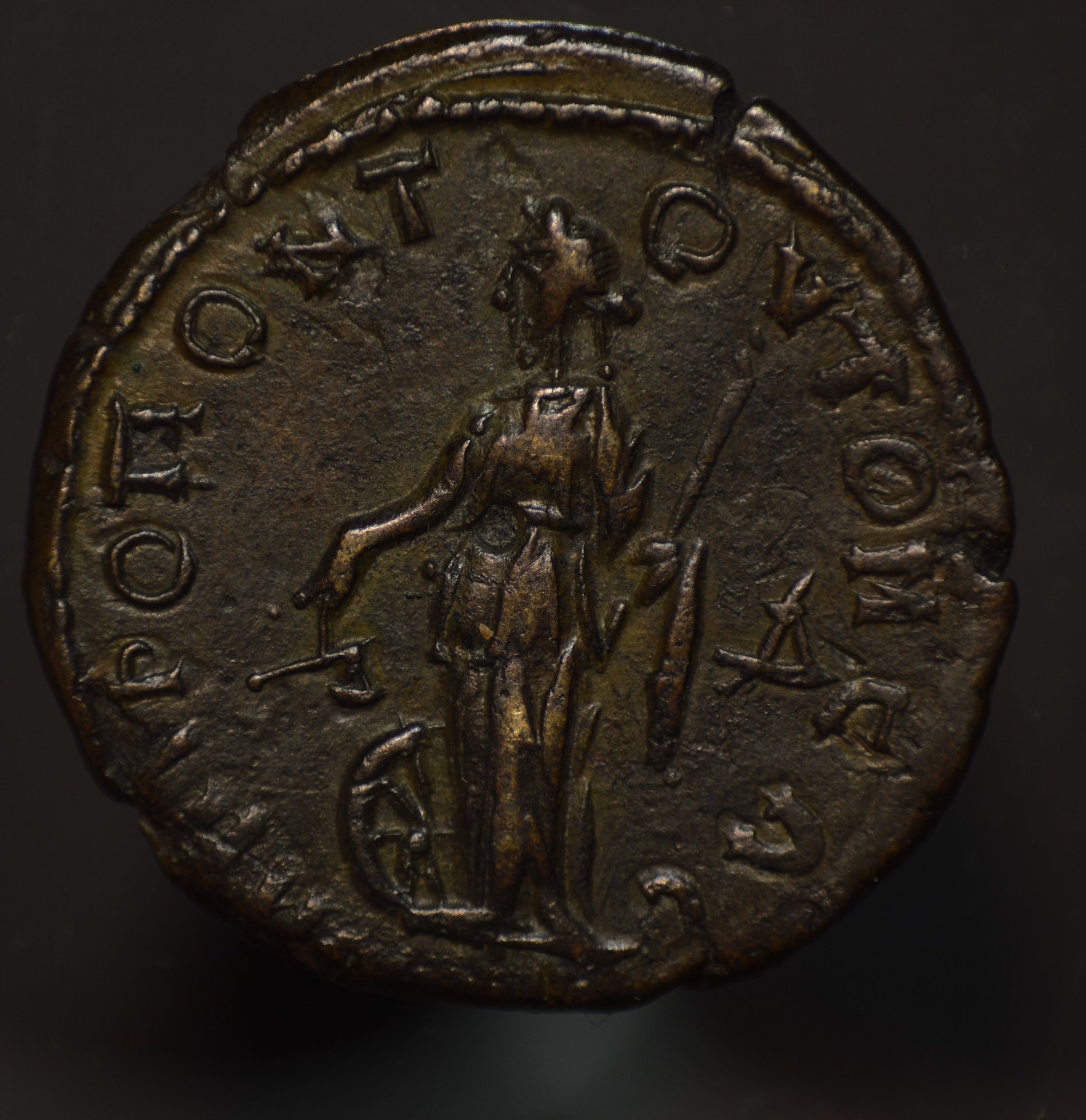Oke, the last ID-request for tonight Thanks in advance, learning a lot here! So this is another relatively large coin: Weight: 13.88 g Diameter 29 mm Unfortunately, the vis a vis observe is somewhat pitted. The reverse however is very sharp. It shows some resemblence with the coins I've found of Macrinus and Diadumenian (https://www.forumancientcoins.com/dougsmith/thrace2.html, halfway the page), but it's not the exact same. Would again greatly appreciate any comments!