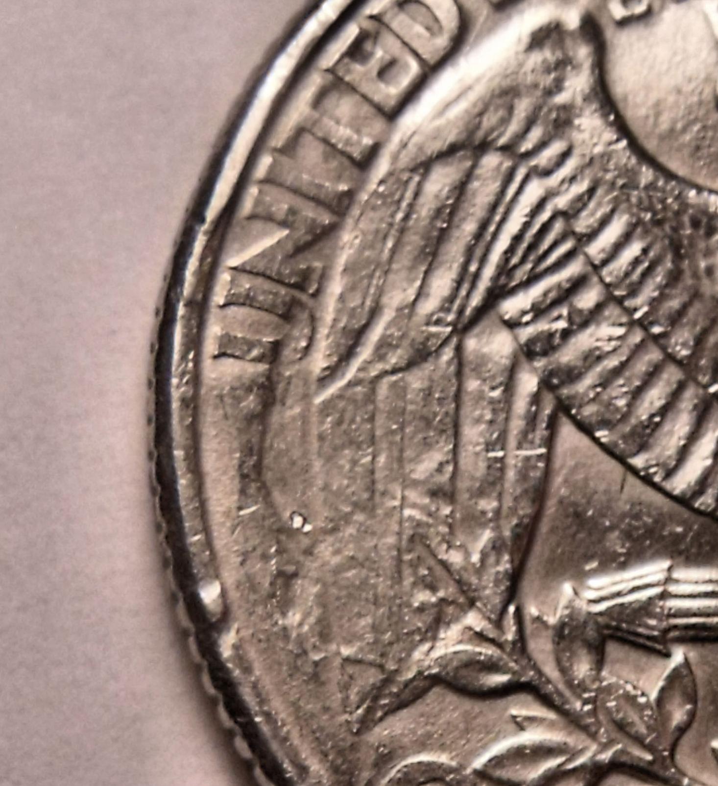 So I have this 1996 quarter I think it is a strike through error... but I could be wrong that's why I'm here. the front is obvious in the pictures what is wrong. the reverse side only has a few spots similar to the front but not as noticeable. On the reverse side by the word United and above the eagles head. well please let me know what your thoughts are... TTFN