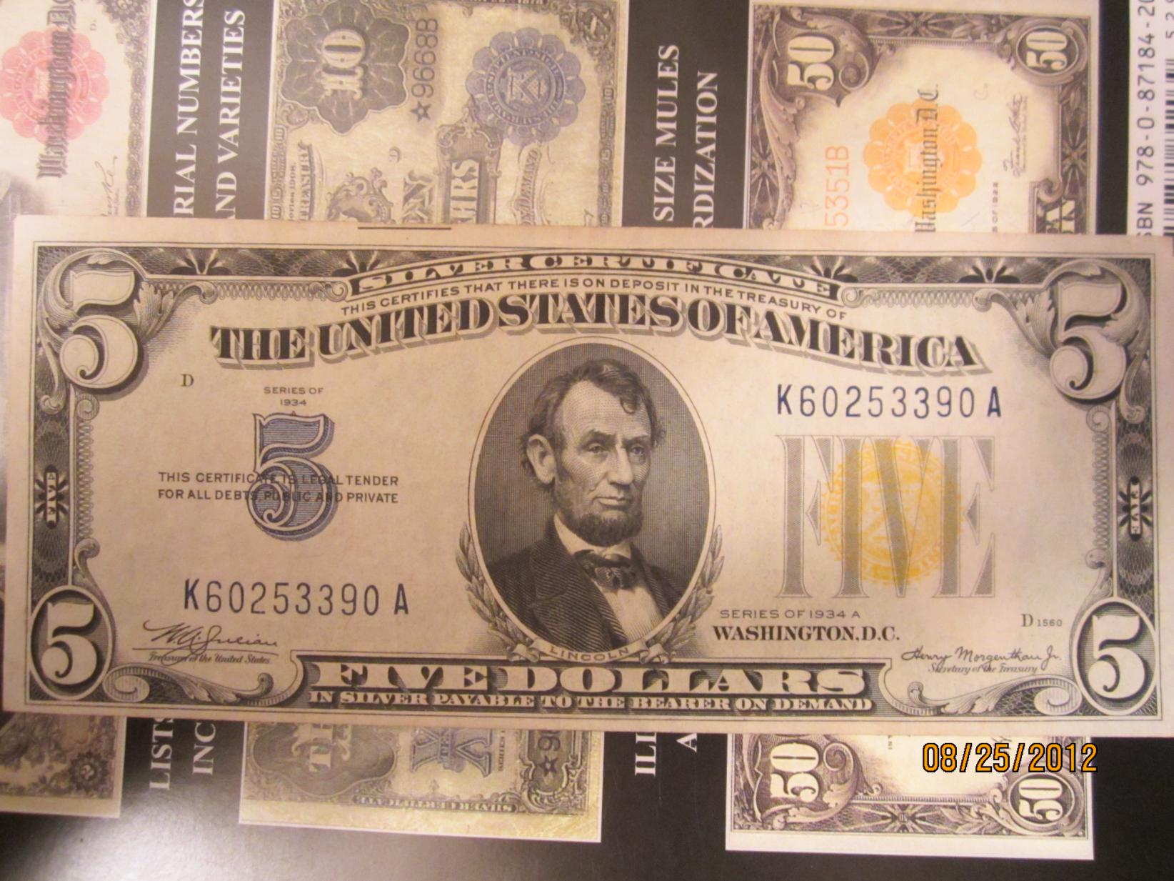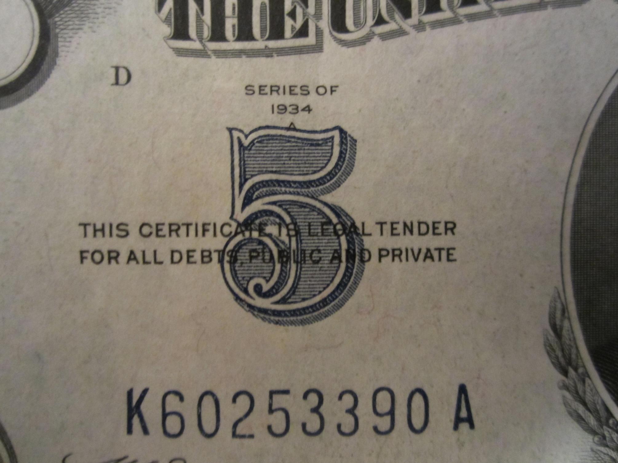 Hey all, I just noticed that the letter A in the "Series of 1934 A" is being swallowed up by the 5 below it. I personally didn't consider it misaligned, until I read that overlapping text or images would qualify as such. Would you say there's any added value in the note because of it? What would be the most you might pay for such a note? Thanks!
