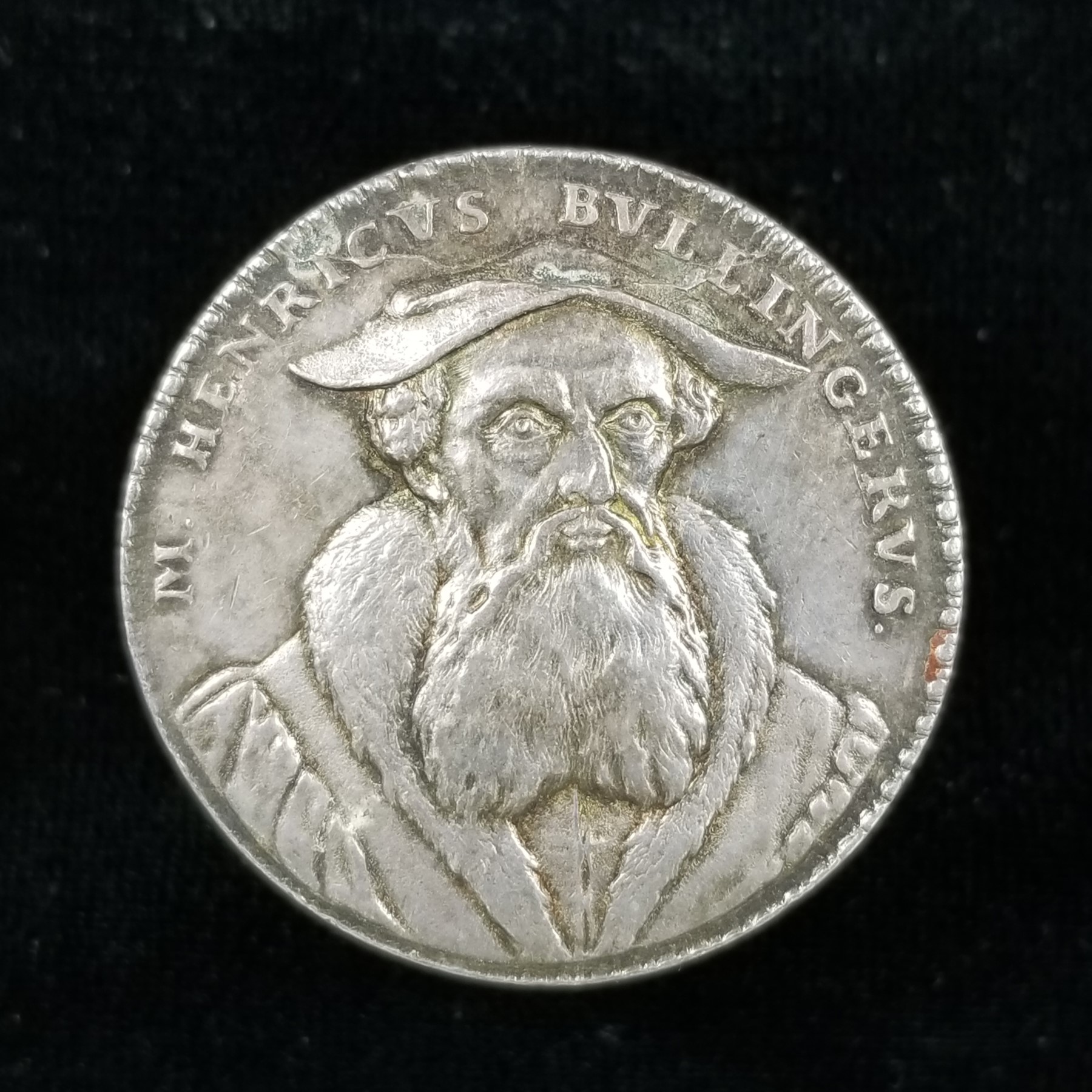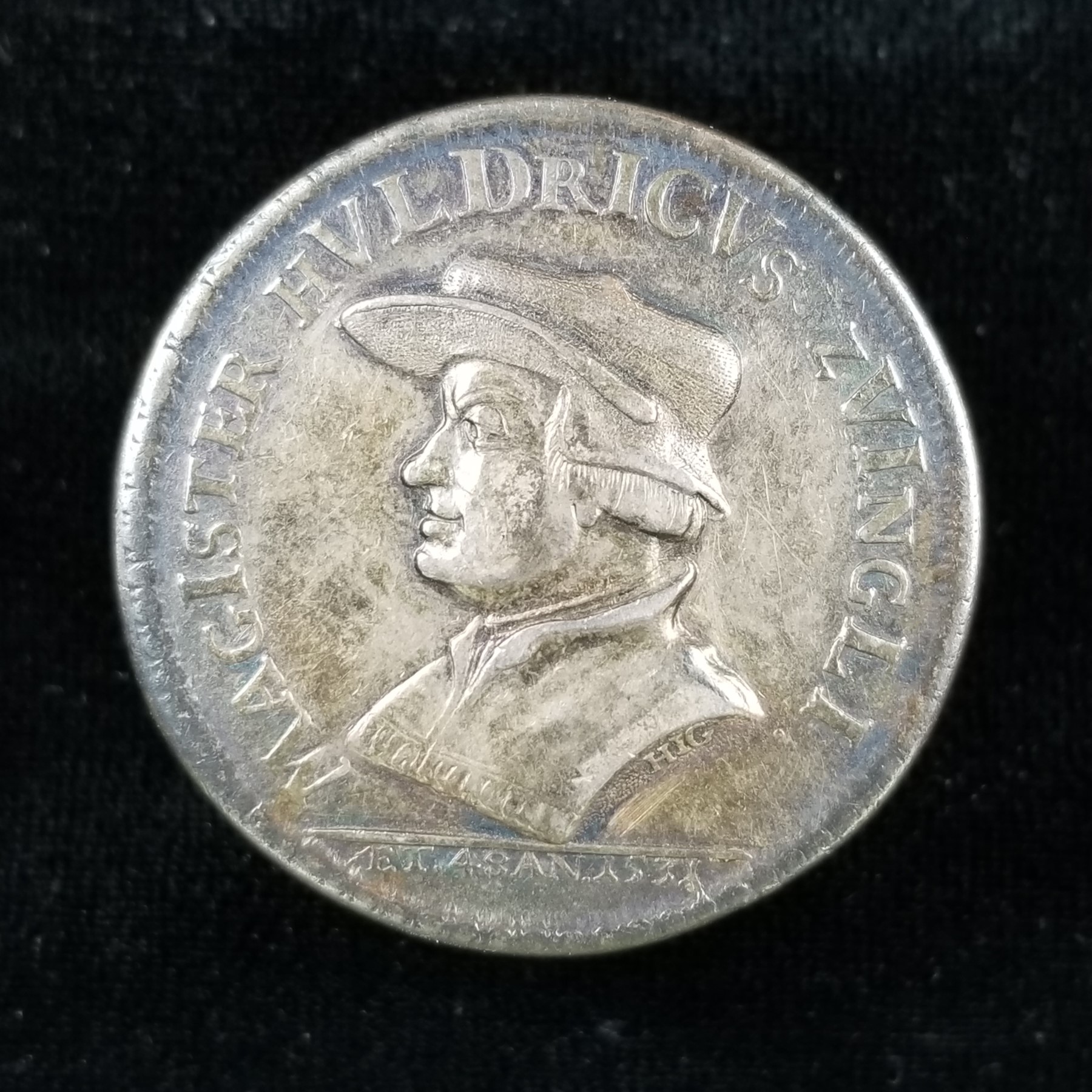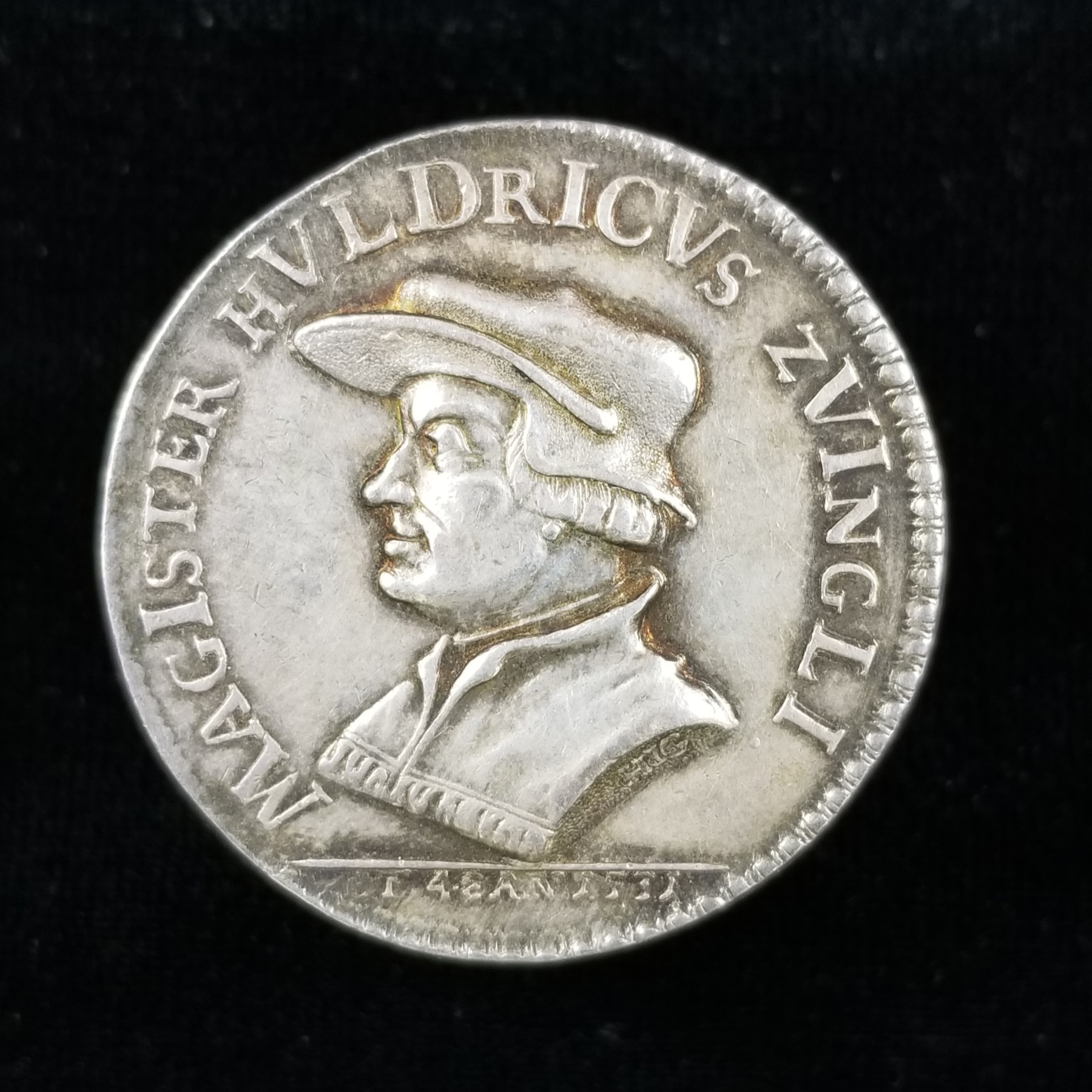 I once had this... umm... whatever it was. It was some kind of Zvingli medal. Looked 18th century to me. Another of these Reformation-themed pieces, I would presume. There were traces of bright luster in the protected areas around the portrait and lettering (which naturally did not show in my scans). Maybe pewter, but maybe it was tin, now that I think about it. So, the chronogram... Let's see... there's M...I... VLD...ICV... VI...LI. Under the portrait, there seems to be: "ÆT 48 AN 1531", so I suppose that means Zvingli was 48 years old in 1531? I sold this piece on eBay later. A person in Germany won it. Then I couldn't find it and had to issue a refund. He was not happy and left me a harshly worded neutral in German. Years later, it has still never turned back up. I wonder if some day I will open a box or drawer and find it. Chronograms make my head hurt. That's probably why I lost this piece. Yeah, that's my excuse. It had nothing to do with desk clutter.