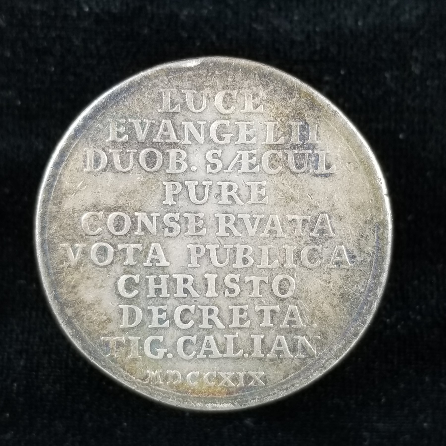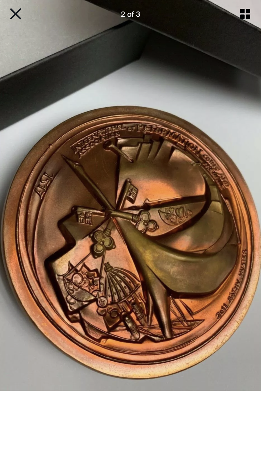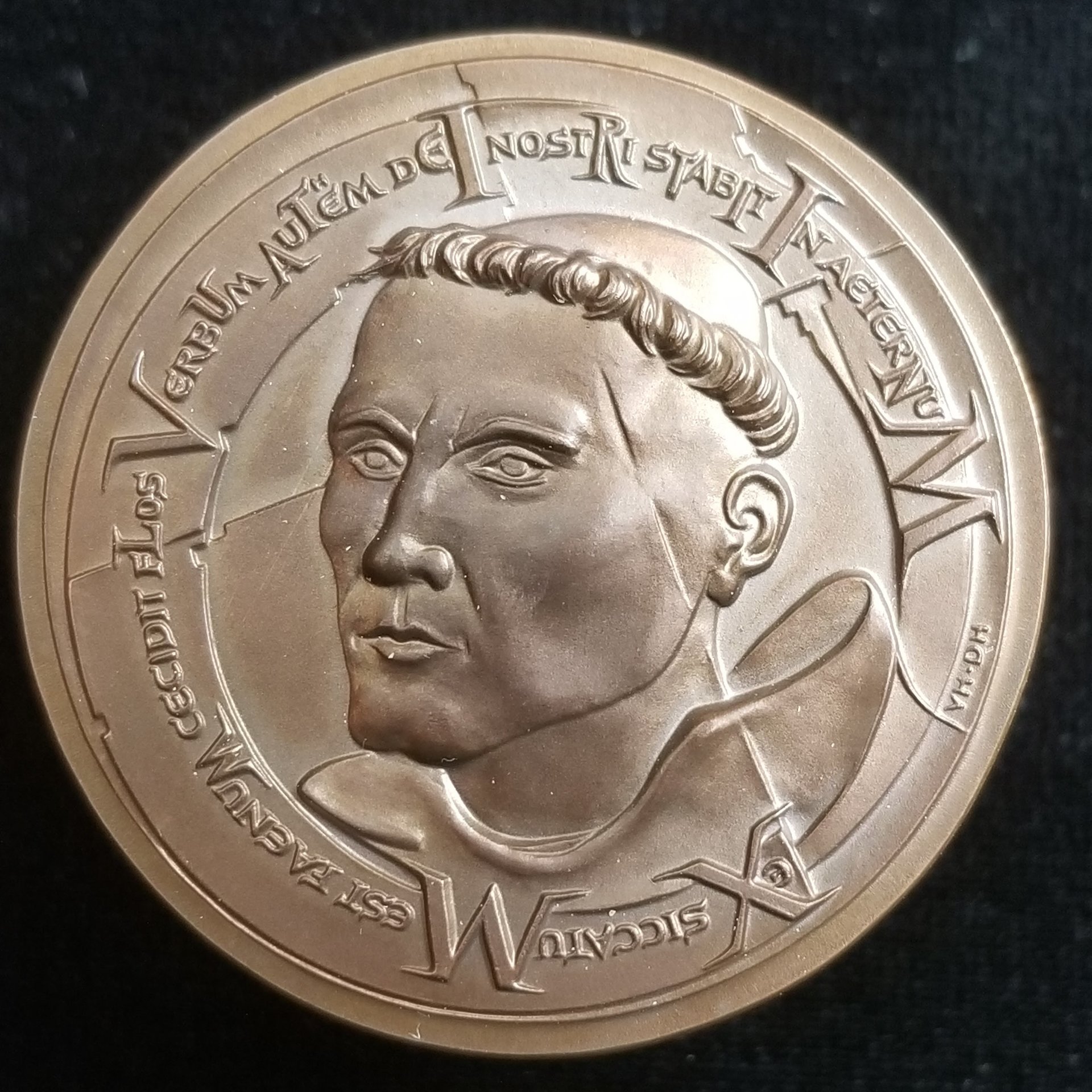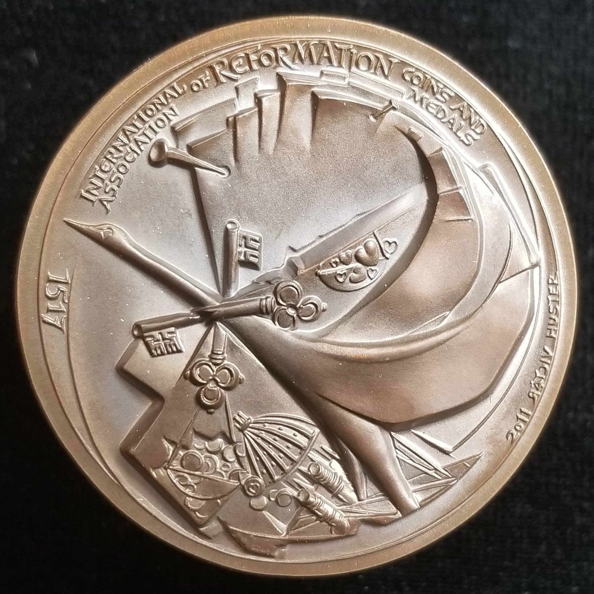 Here is my modern chronogram medal; it was minted in 2011, but has the chronogram date of 2017 on the obverse to celebrate the 500th anniversary of the Protestant Reformation (jointly designed by Daniel Harmelink, collector of Reformation numismatic material who clearly knew the history of chronogram-dated material in this genre, and Victor Huster [noted for his distinctively stylized medallic art])