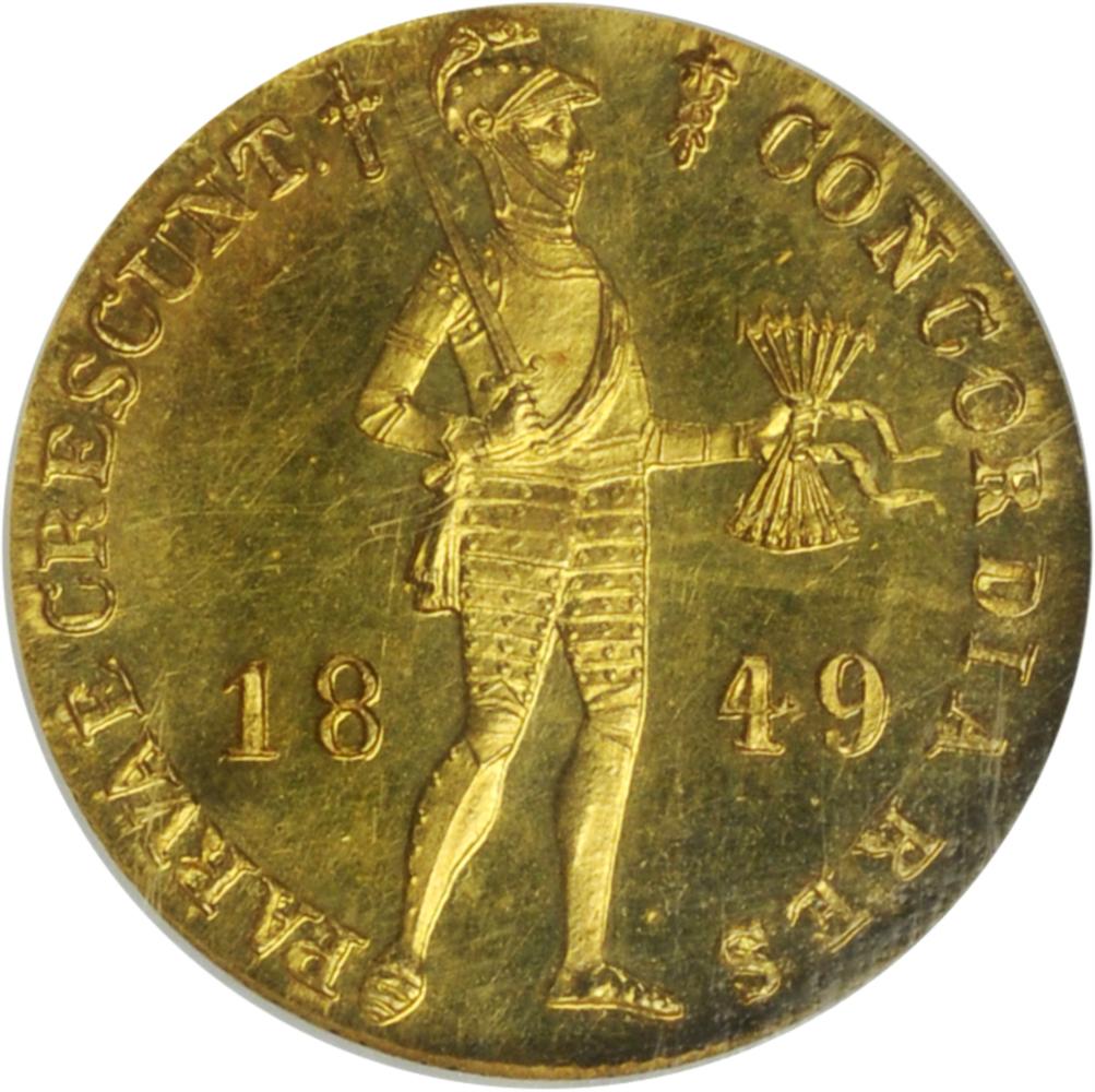 Here's one for you ... a real treasure of mine !! Country: RUSSIA Type: Ducat Date: 1849 Certification: NGC #1915585-012 Grade: PF 64 Cameo Coin Information: Design: OBVERSE: Legend around inner circle with standing knight in full armor holding a sword and a sheaf of arrows. The arrows signify the unity of the northern provinces, which banded together and signed the union of Utrecht in 1579, which was there declaration of independence from Spain. Legend – “CONCORDIA RES PARVAE CRES****” translates “Union Makes Small Things Grow” ~ REVERSE: Legend or motto on tablet. “MONETA ORDINUM PROVINCIARUM FOEDERATARUM BELGII AD LEGEM IMPERII” translates “Coin of the Provinces of the United Netherlands According to the Law of The Empire” Mint: St. Petersburg Mintage: Unknown References: KM #83.1 (Netherlands) / Fr. 161 Specifications: Diameter – 21.0 mm Weight – 3.5100 g. @ 0.9860 Gold = .1113 oz AGW Acquired: January 2010 Providence: None Notes: ➢ "1849" dated ducats were struck at St. Petersburg mint from 1849-1868. 4,350,190 per St. Petersburg mint records. Seems like a lot yet you do not see a lot of these on the market!! A common coin in its day, remember that the ducat was the best known gold trade coin in its day and the Russian Armies and Imperial family traveled extensively through all of Europe and central Asia; therefore it was commonly melted to produce other gold coins, jewelry, etc. of the other countries?? ➢ As to whether or not this is a real proof strike coin vs. a proof-like commercial strike coin ... I posed the question to Mr. Rick Ponterio (Formerly owner of Ponterio & Associates & now with Bowers and Merena Auctions and a noted world coin expert) himself, asking him to review the coin in-hand and give me his opinion .... his email answer "In my opinion, this coin is a proof, and not a prooflike business strike. NGC has properly designated it as a proof." ➢ Now for a proof 1849 St. Petersburg ducat. Do they exist? .... Obviously based on this specimen they do, but they have to be rare ... Could it have been a special proof presentation coin for the State Treasury or purse of the Russian Imperial family of Nicholas I or Alexander III ??? ➢ In all my extensive reference materials (both book and internet) I can find no record of any "proof" ducat pre 1900 (Dutch or Russian). This is a very rare and exceptionally choice coin.