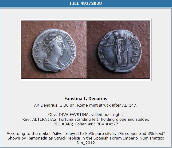 The counterfeit report is in error because it omits the SINGLE BIGGEST GIVEAWAY that it's fake: this reverse was only used on aurei, not denarii, of Faustina I. They have misidentified the coin as a copy of RIC 348. It's not.