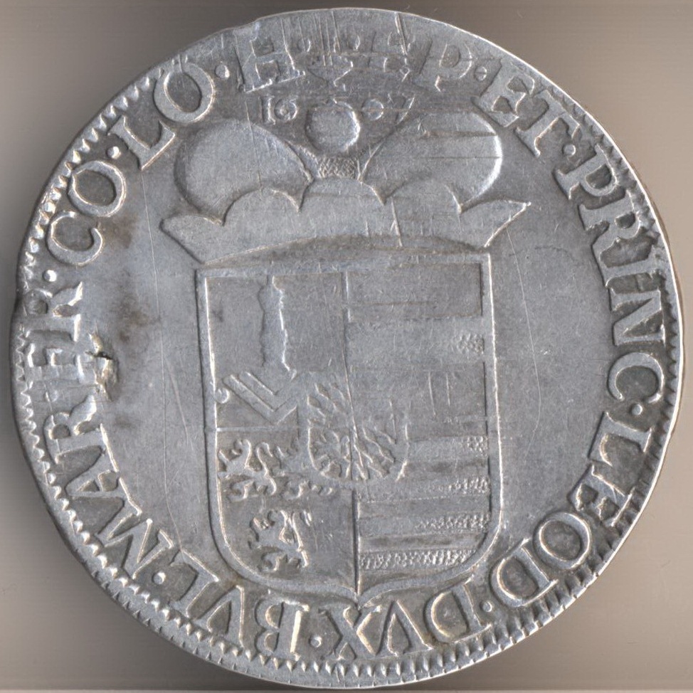 I think @willieboyd2 pinned it down. I was thinking Cologne because of that COL in the legends, but didn't get very far when I was plinking around on my little tablet earlier. I could see the "3" of the "63" in the legend and wondered if that was part of a 2-digit date, but the "6" was too indistinct for me to make out in the picture so I wasn't sure if I was really seeing numerals there or some other kind of mark. (Thanks, WB2). So assuming the "(16)63 Cologne 2 albus" attribution is correct- and I think it is- here's the NGC/Krause listing. Note the fairly close match in the picture.