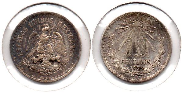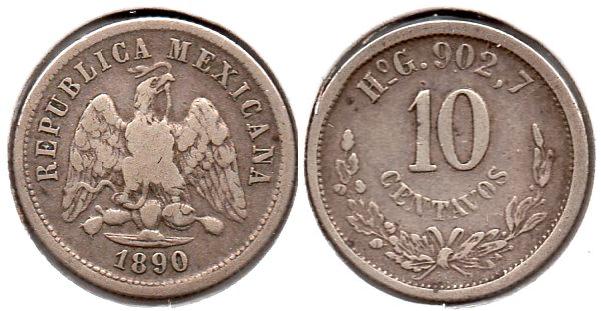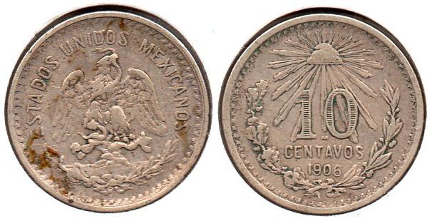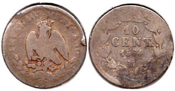 10 Centavos Civil struggles along with Mexico's default on foreign loans lead some European nations to contemplate an armed occupation of Mexico's port, Veracruz, in order to pressure the Mexican government's acquiescences in repaying it's loans and not defaulting. The Spanish and British fleets left the port and abandoned the idea, but the French under Napoleon III stayed and began an invasion of Mexico, which had the backing of Mexican conservatives who despised the current liberal government of Benito Juarez. After a series of battles, the French managed to secure the capital, Mexico City, for themselves. Napoleon III installed a relative of his, Austrian Archduke Maximillian, as Emperor of Mexico in 1864. Maximillians efforts to reform the country lead to discontent by the Mexican conservatives. The liberal politicians, though their policies were similar in ideology, didn't recognize the legitimacy of Maximillian's government because it had been imposed by a foreign power and was not duly elected by Mexican population. The whole adventure was doomed to fail. Eventually, Emperor Maximillian was tried and executed on June 19th 1967. The effort to modernize Mexico's financial situation is reflected in the decimalization of it's currency and coinage. Mexico - 10 Centavos - 1864 M - KM #386.1 - 2.7073g, 0.9030ag, 0.0786oz, 18mm True content: .9027ag, .0973 copper. ------------------------------------------------------------------------------------- Known as the "Standing Eagle" type this issue began in 1869 and ended in 1897. Mexico - 10 Centavos - 1890 HoG - KM #403.6 - 2.7070g, 0.9030ag, 0.0785oz True content: .9027ag, .0973 copper. ------------------------------------------------------------------------------------- This is the first issue of the 10c to be minted only at the Mexico City mint. Mexico - 10 Centavos - 1906 M - KM #428 - 2.5000g, 0.8000ag, 0.0643oz 18mm True content: .800ag, .200 copper. ------------------------------------------------------------------------------------- Because of rising silver prices in 1919, the Mexican mint issued a large bronze 10c coin to replace the small silver 10c. Sorry, this is the only example I have for this issue and I believe it to be a cast fake. Mexico - 10 Centavos - 1920 Mo - KM #430 - Bronze, 12.0g, 30.5mm True content: .950 copper, .025 tin, .025 zinc. ------------------------------------------------------------------------------------- The silver 10c was reintroduced in 1925 as silver prices stabilized. Mexico - 10 Centavos - 1933 M - KM #431 - 1.6600g, 0.7200ag, 0.0384oz 15mm True content: .720ag, .280 copper.