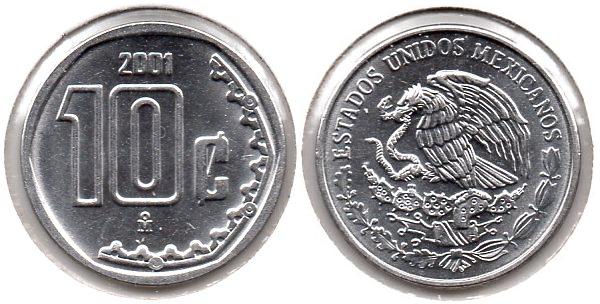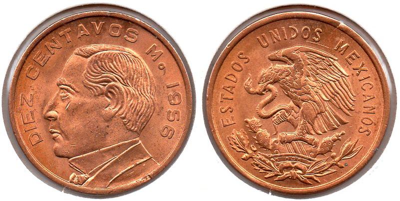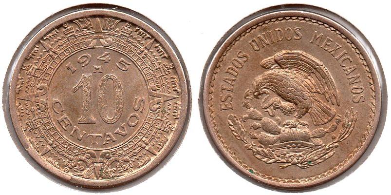 10 Centavos This 10c was authorized on March 26th 1936. Production runs began in May 1936. The design is similar to the 5c of the same period. Mexico - 10 Centavos - 1945 Mo - KM #432 - CN, 5.5g, 23.5mm True content: .800 copper, .200 nickel. ------------------------------------------------------------------------------------- This issue began 9 years after the older "Aztec Calender" issue had ceased being produced. The image is of Benito Juarez a Zapotec Indian. He was president of the republic before, during and after the French intervention period. His liberal policies were hailed by liberal thinkers in Europe. So beloved was Benito Juarez by free thinking radicals, that a young couple in Italy with anarchist leanings named their son after him, Benito Mussolini. Mexico - 10 Centavos - 1956 Mo - KM #433 - Bronze, 5.5g, 23.5mm ------------------------------------------------------------------------------------- Mexico - 10 Centavos - 1977 Mo - KM #434.1 - CN, 15mm ------------------------------------------------------------------------------------- Mexico - 10 Centavos - 1978 Mo - KM #434.2 - CN, 15mm ------------------------------------------------------------------------------------- Mexico - 10 Centavos - 2001 Mo - KM #547 - Stainless Steel, 17mm