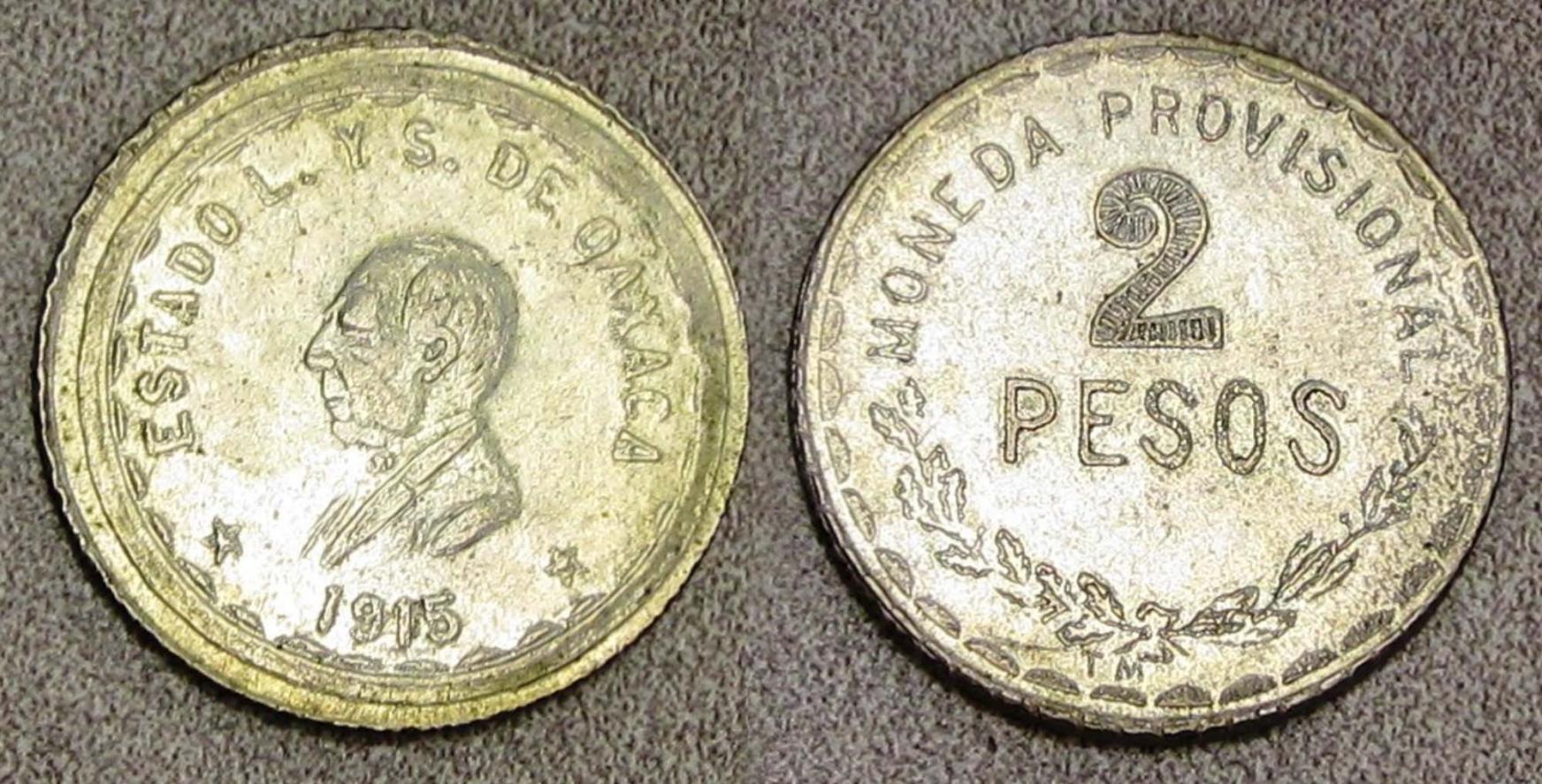 1915 Oaxaca 2 peso and a 1771 Pillar Dollar Here is a 1915 Oaxaca 2 peso and a 1771 Pillar Dollar. Why do I suddenly have an urge to go out & buy a Mexico coin?