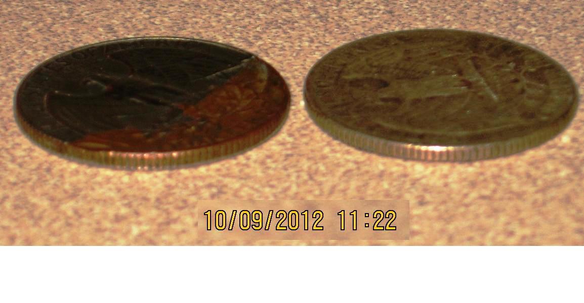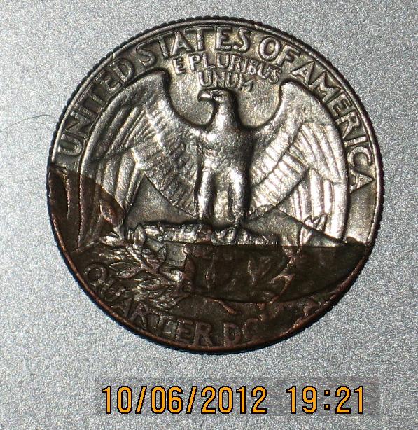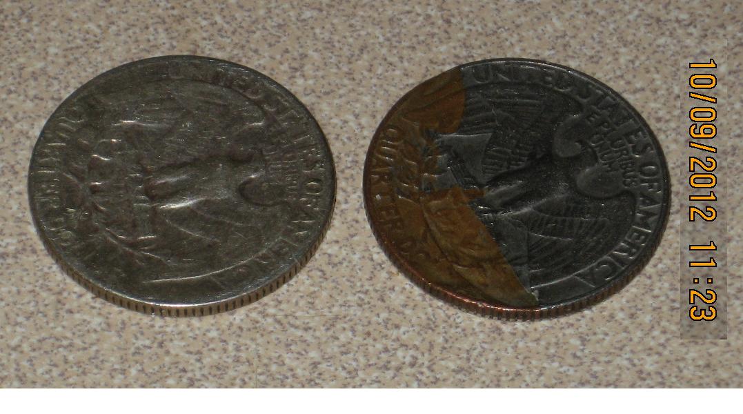 I think the quarter came into contact with a material that has eaten away at the outer layer of metal.