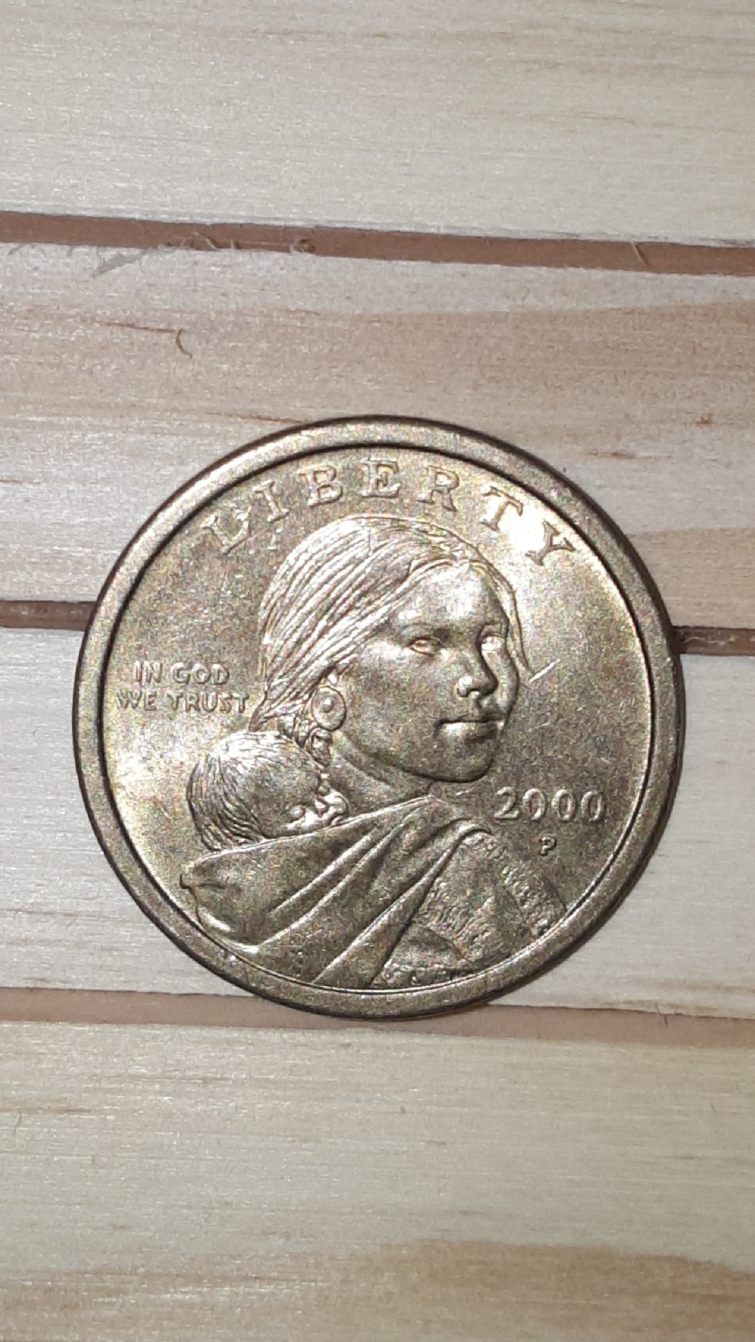 2000 p Sacagawea one dollar. The reverse. On the eagle there is two lines going through his wing and body.