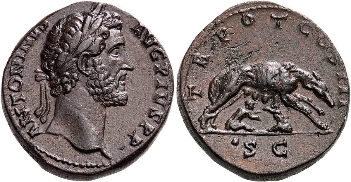 That's Romulus and Remus under the she-wolf right? It seems like Antoninus Pius was trying to associate himself with the legendary founders with that design.