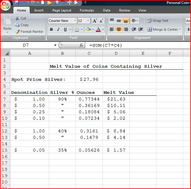 You can actually set up a MS Excel spreadsheet to do this for you. All you have to do is create a spreadsheet, and formulate 4 cells with the silver content in ounces to be multiplied by the spot price in another cell. Just enter the spot price as it changes and you'll see the changes in melt value on your coins.