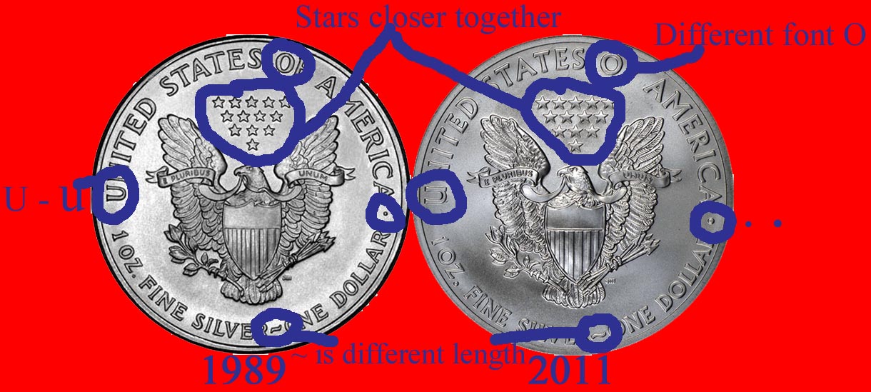 I was bored today and thought it would be a good idea to look at my collection. I was comparing two different year eagles that I have. I noticed that every older eagle weighed significantly more than recent date eagles. For example 1989s weighed .2-.4 grams over(used 1989s because I had more than one). The 2011 eagles weighed .05-.1 gram over(used 2011s because I had more than one). Every coin tested was BU. Also, I noticed many design changes between the two years. I tried researching this and there was no information available. Below is an image of two eagles side by side showing the changes between the years. I do not know when the design changed however these were the years that I personally had and compared. Images of eagles are stock photos and not my own.
