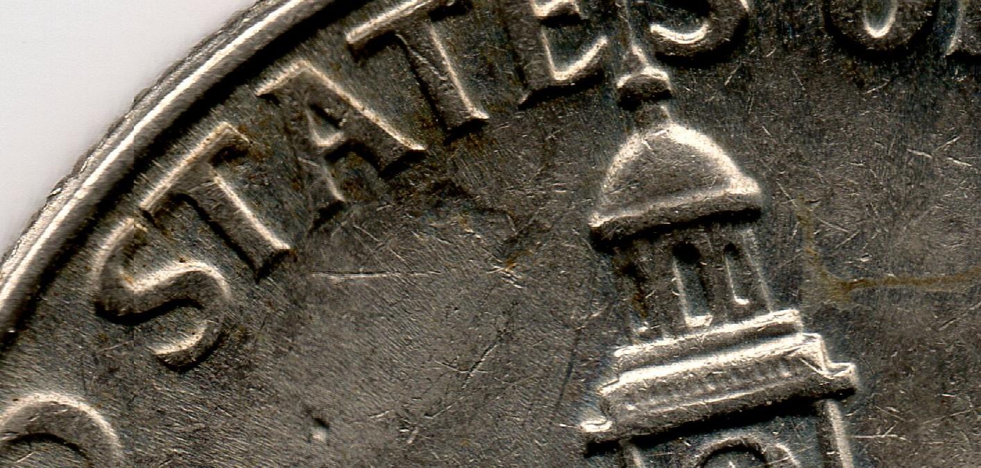 I think the color is normal outside toning. Just left of the missing piller is something on the flat part of the metal. That made me think of lamination. Filled die is a possibility of course.