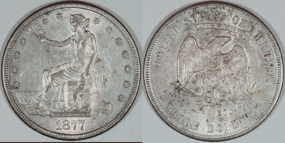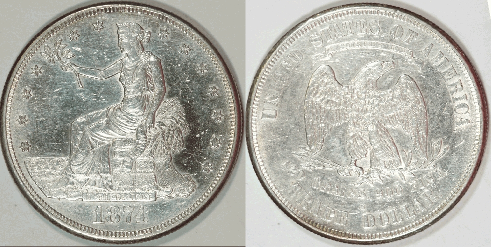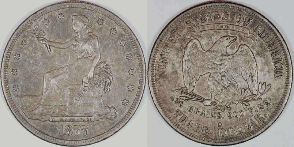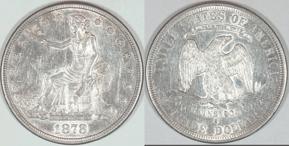 Awesome Trade dollar, a VERY good buy at under $300.00. It is not often one can buy an AU-58 Trade dollar for less than half retail, especially one with this awesome eye appeal. With some searching you can find a nice looking AU-58 Trade dollar in the $600.00 to $700.00 range. An AU-50 would be from about $300.00 to $360.00 for most common dates.