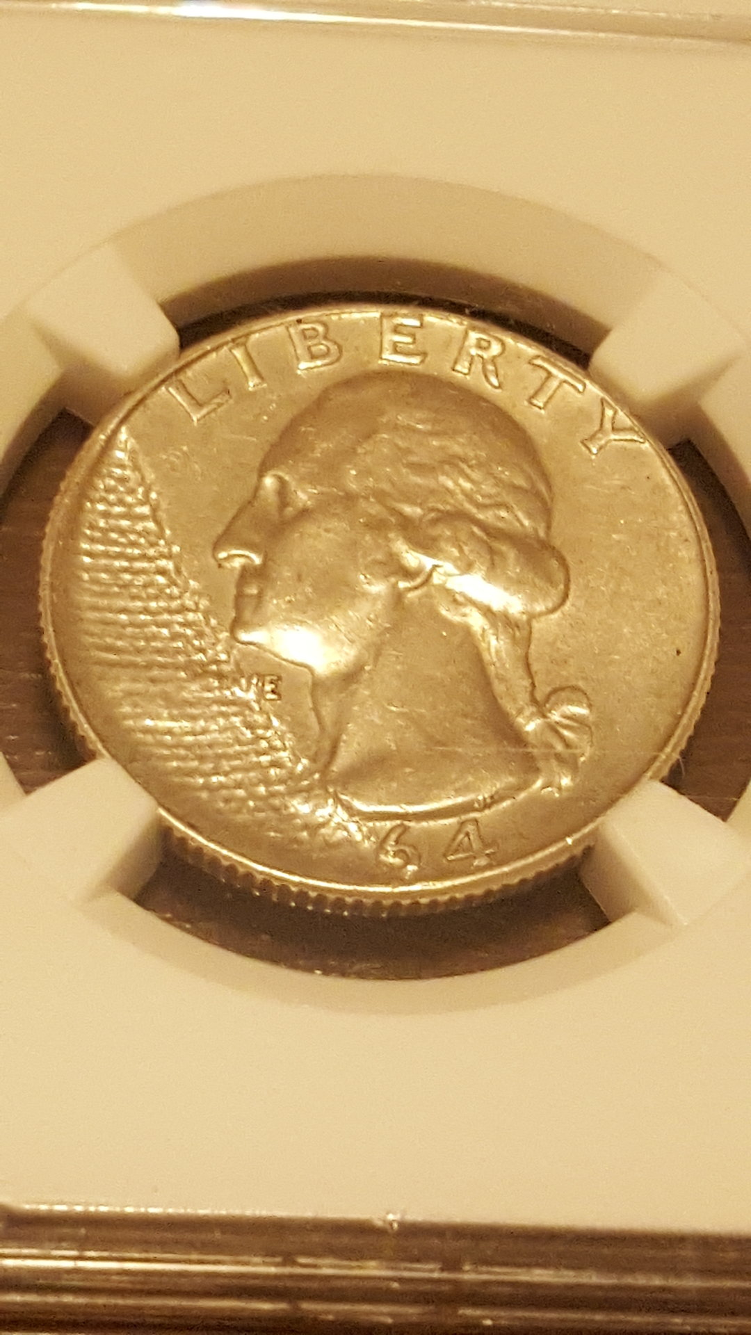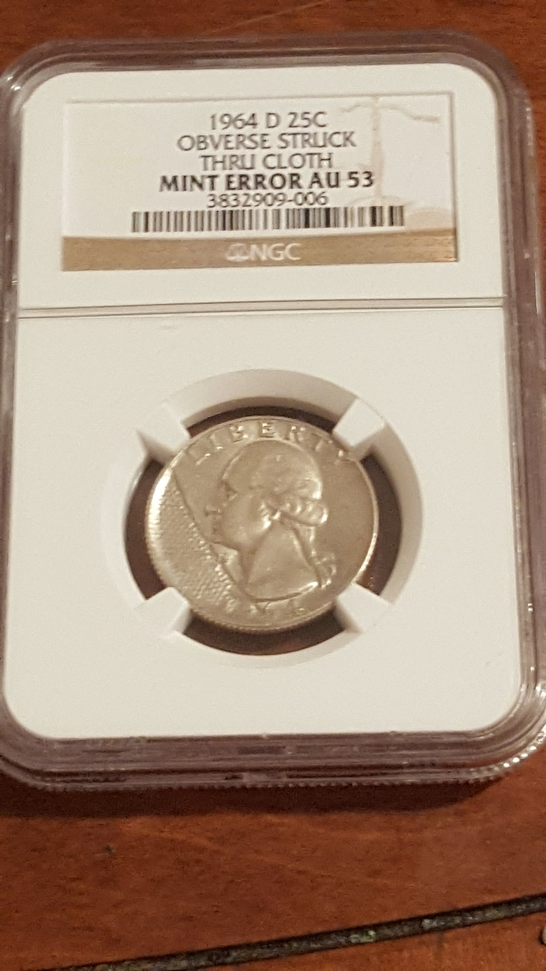 I purchased a raw, 1964-D quarter at a coin shop for a few bucks. What made this coin unique was that it was struck through cloth. The coin was interesting enough to me to have it slabbed. (See pics.) The weave pattern of the cloth is well-defined. Apparently, this type of error is usually caused when a mint employee cleaning a die with a cloth inadvertently lets a piece of cloth remain in the press so that it gets between the planchet and the die: the cloth is pressed onto the coin, causing the weave pattern. Anyway, I thought it would be interesting to have others post their struck-through-cloth, U.S., coins. I would like to see who has the earliest date. (It won't be me.)