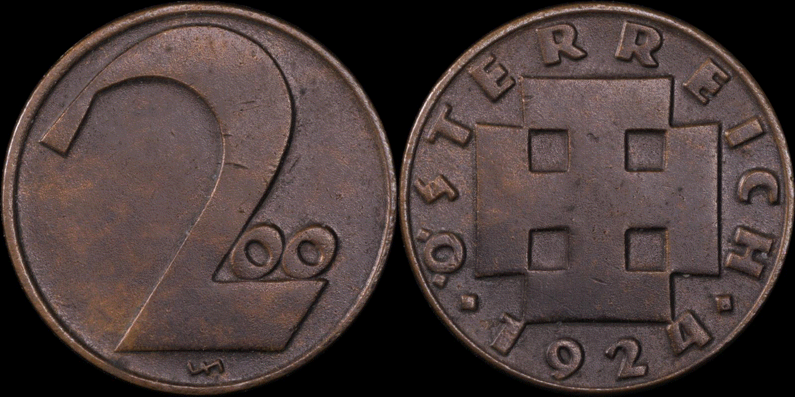 Here, then, is the 2 Groschen that replaced the 200 Kronen. I liked the first design better, without having the numeral reduced in size to make room for "Groschen".