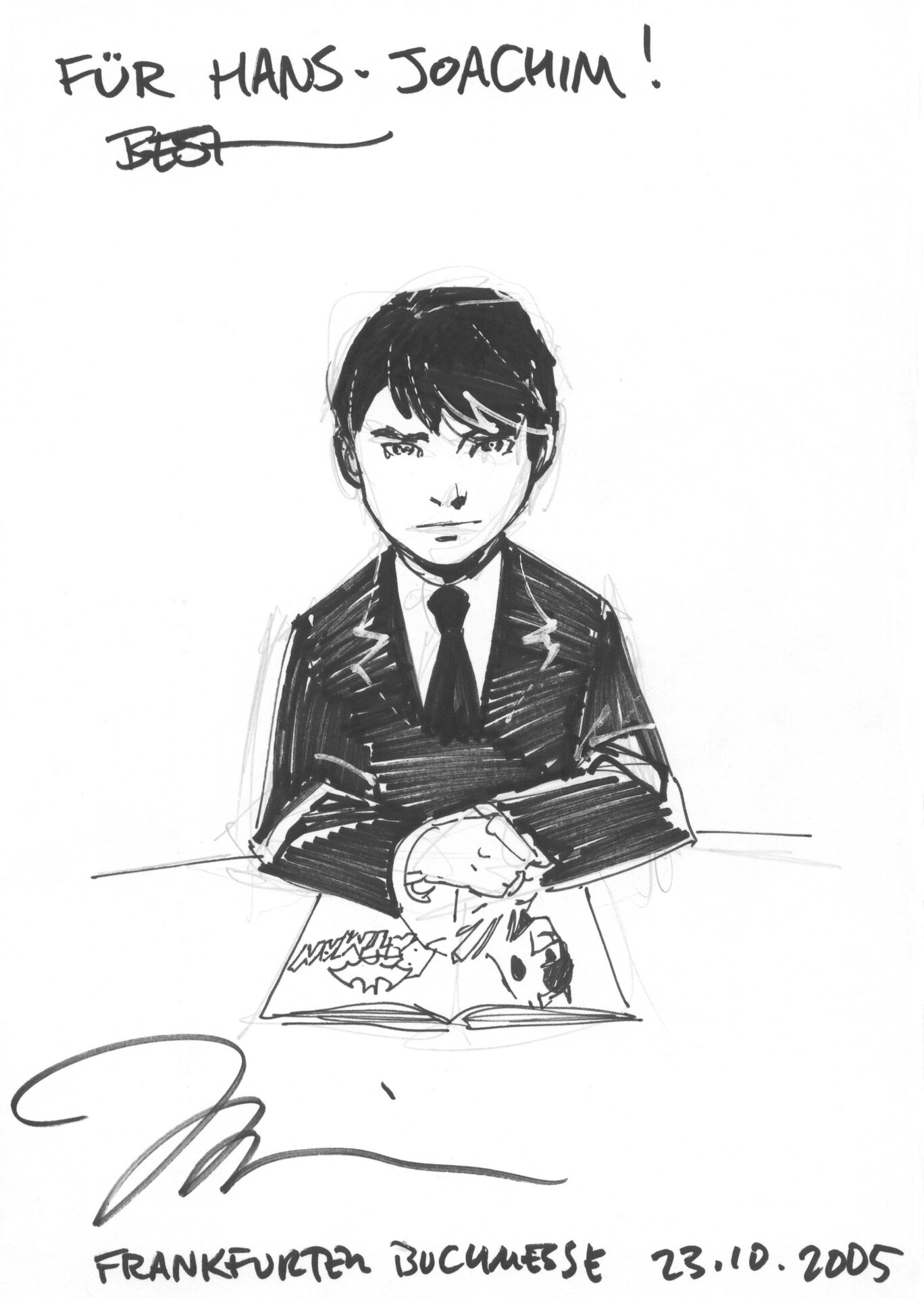 Here are 3 scetches (French: dedicaces) from Tardi, Moebius and Bilal. Altogether I have about 12000 of them. Some years before there was a nice site in France where I have posted most of my important scetches. Unfortunately the site is no longer maintained. But you can still look at them under http://bededicaces.free.fr/ Go to "Dedicaces", then to "Contributeurs" and click on "Hans-Joachim und Irmtraud" Enjoy! Jochen