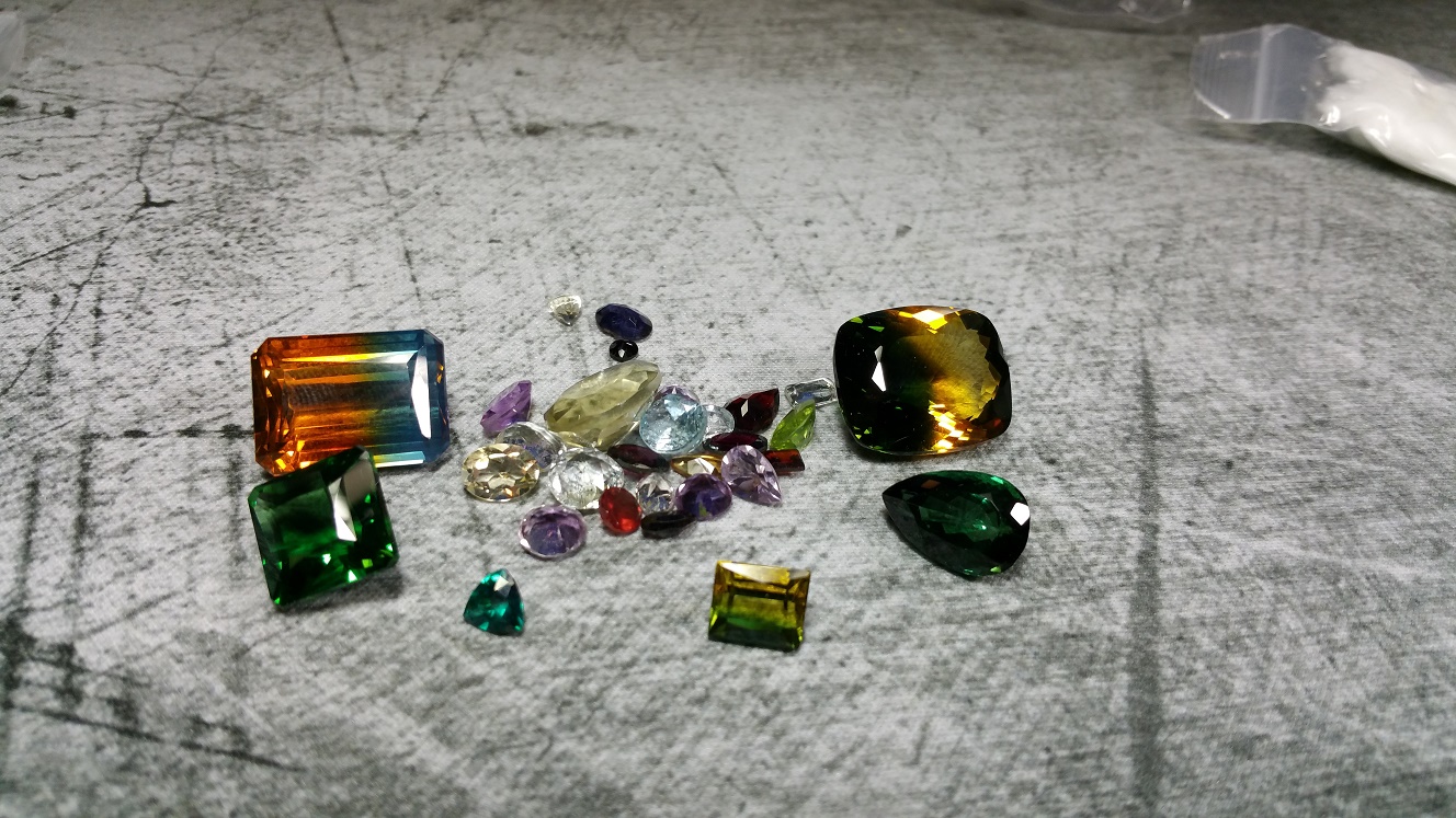 These are some of the gemstones I have left over or am collecting. All the stones in the middle are screw ups that I saved. Faceting can be tricky. The two larger ones have been radiated. The smaller bi-color rectangle cut is natural yellow-green citrine. The small trillion cut in front is Paraiba Tourmaline.
