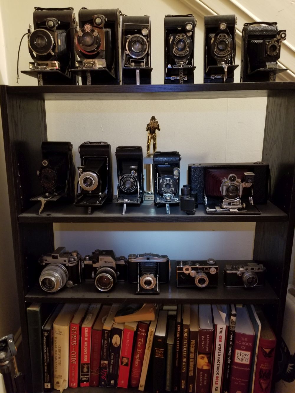 During the 60s, while my brother was living in Greece he bought a Nikon F (attached external light meter) w/ every accessory he could think of. Durings the 70s he told me he could never get it to take a decent picture. He gave it to me w/ all of the accessories. While I was in Washington, DC, I took it to the Nikon dealer that was used by professional photographers. They lubricated the lenses and recalibrated the shutter and light meter. That camera still takes great pictures. Some years later, my mother gave me her old Leica M4, another great camera. Besides pictures of the Nikon and Leica I've included a photo of some of my folding cameras I display.