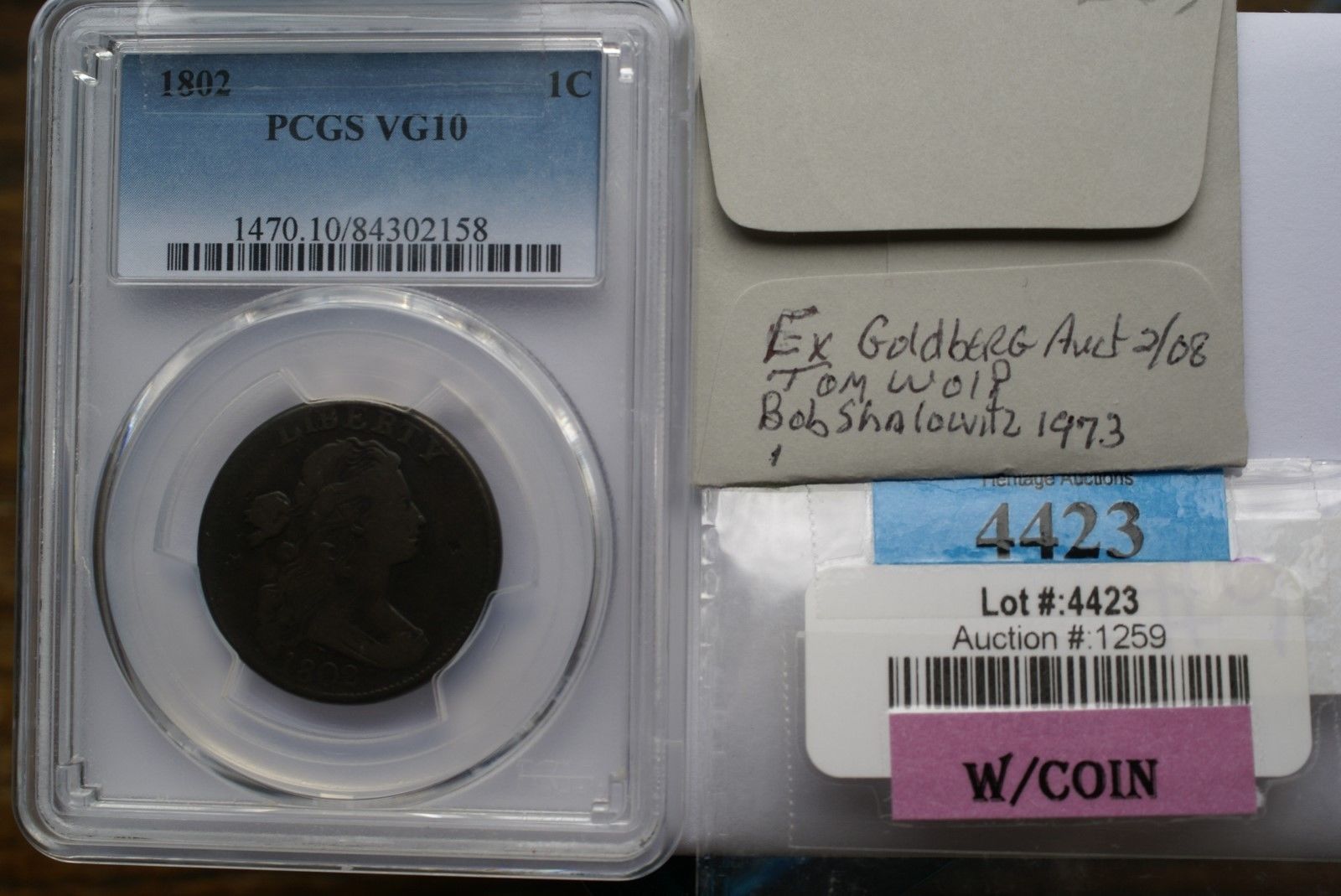 I'm really getting off the rails. This is a common S-229, but it's higher grade than I usually get and is even straight grades VG10 by PCGS. But it intrigues me because, despite it's being called a Die State I which is rare enough, it actually appears to be a die state between II and III having the crumbling N(T) of S-227 III specifically stated as absent in I and not mentioned in II which is also rare. But the obverse does not show any trace of the ARC crack through LIBERTY of III. This is the presumed emission sequence described on a S-227 die state III. The emission sequence is a little confusing: S-226, NC-1, S-229 States I and II, S-227, This coin fits here, S-229 State III, NC-2, and S-229 States IV through VII. Up for your consideration is a 1802 Large Cent PCGS VG10, S-229. Breen Die State I. The slightly glossy chocolate and steel-brown surfaces show a thin scratch on the neck and a small planchet void in the right obverse field. The date and legends are easily legible. Ex: Robert Shalowitz; Thomas Wolf; Pre-Long Beach Auction (Goldberg, 2/2008), lot 1270; Rod Burress (6/2008). (Includes Original paper flip and auction stickers). 9/8/2017 From The Padula Family Foundation Collection. (NGC ID# 224E, Variety PCGS# 36299, Base PCGS# 1470) Auction 1259 | Lot 4423 » Large Cents 1802 1C S-229, B-6, R.2, VG10 PCGS.... Bid Source: HA.com/Live I won this for about $162 which is $30 less than it sold for last year on the Heritage Auction. I've got to stop buying every coin that intrigues me though.
