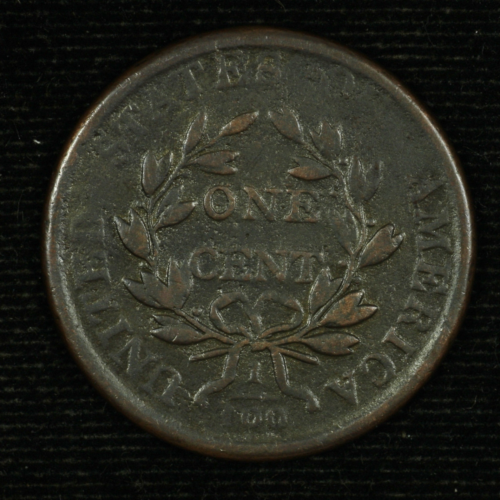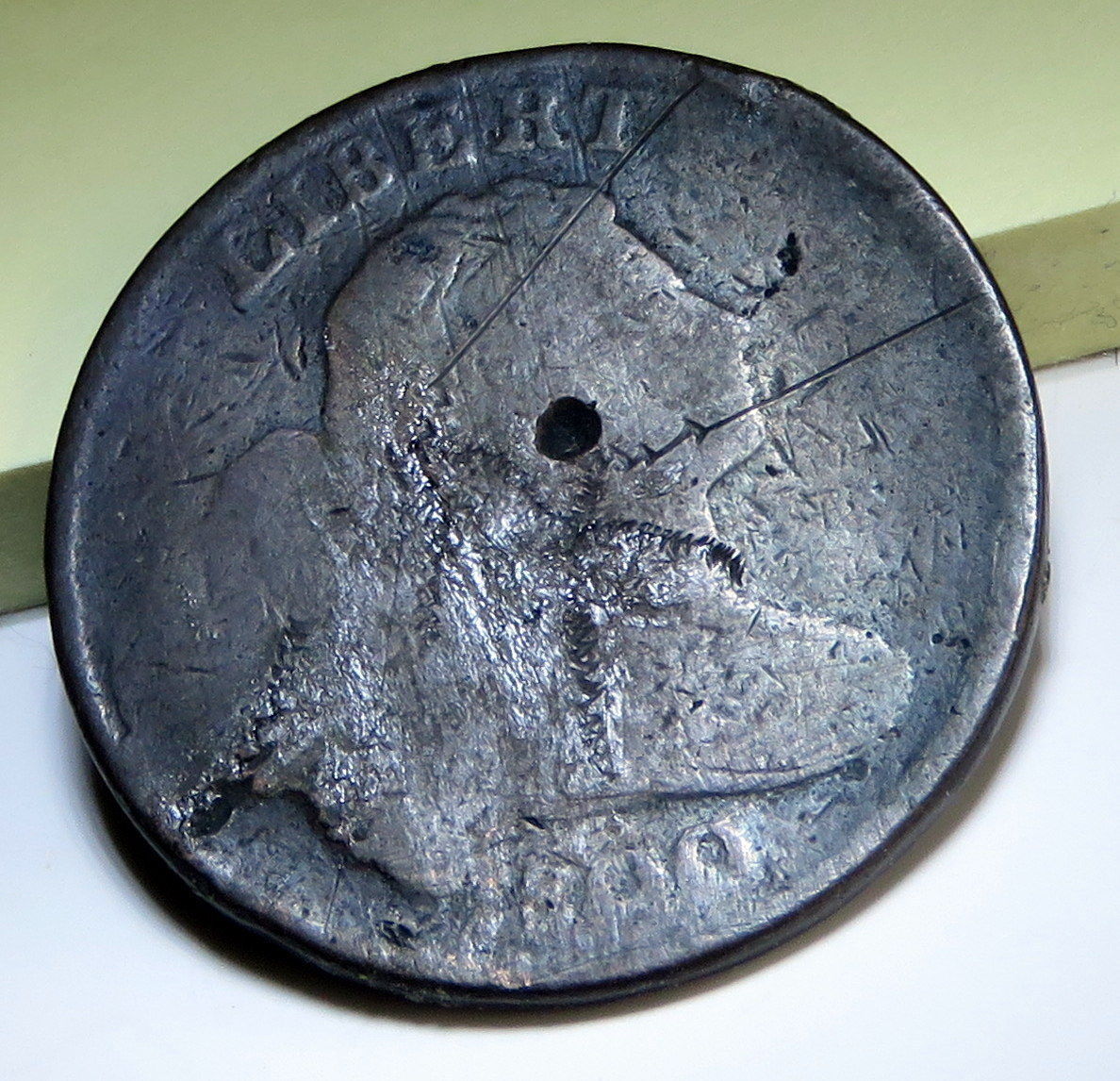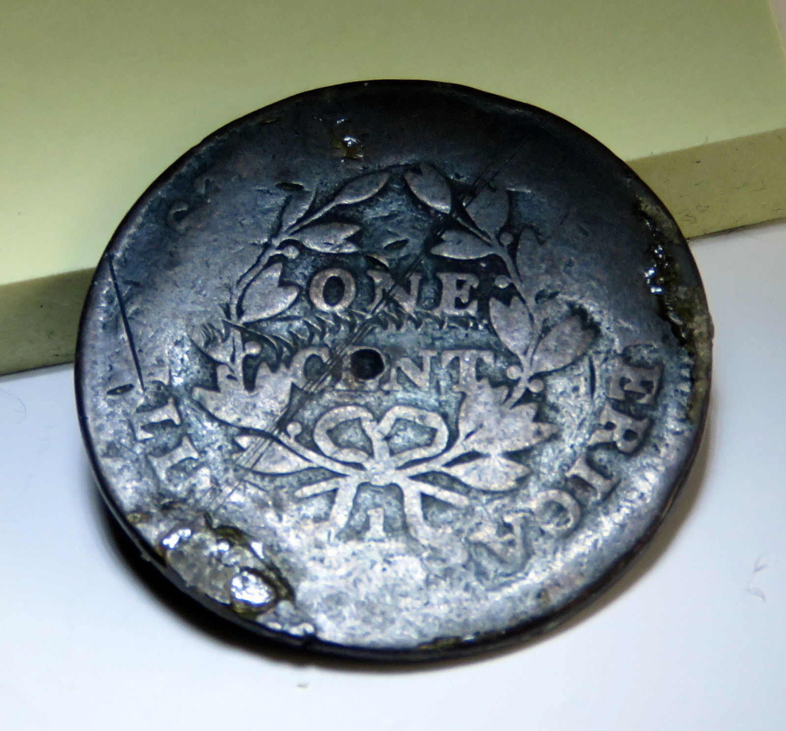I hadn't noticed on the image, but this was double struck with the first image showing at the date (creating the effect of an overdate) and on the reverse inside leaf pair at O(N) just above the graffiti. It stands out in the copper more than in the photo. Also, some of the "Corrosion" at the edges turned out to be glue or lacquor.