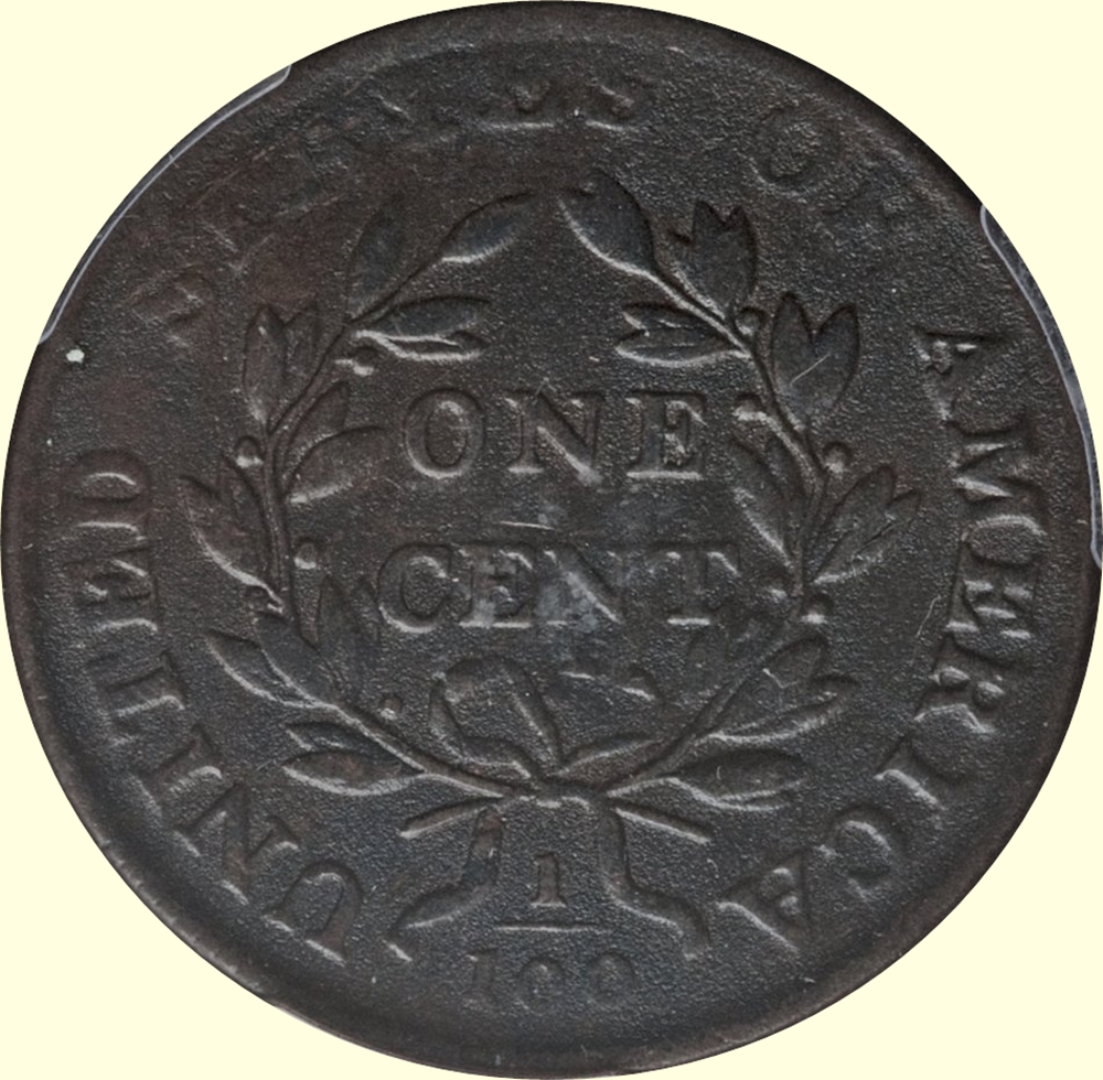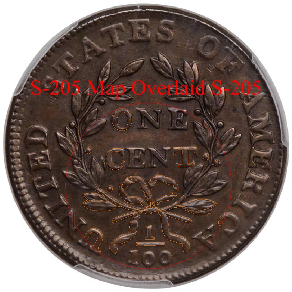 I've highlighted the point of concern for the Obverse 14 (S-208) attribution, even though it looks like the best candidate. It does look like the early die state which is quite different than the middle and late die states. The spacing of AMERICA with no letters touching is also compelling. The confidence builder is a string of chips lined up from the rim through the T to the head that disappears with the progression of the die. The reverse has some of the same problems I was having before but the direction of the stem works. The other things may be accounted for by wear and pmd. Thanks a lot for the assist.