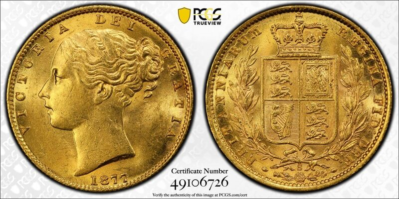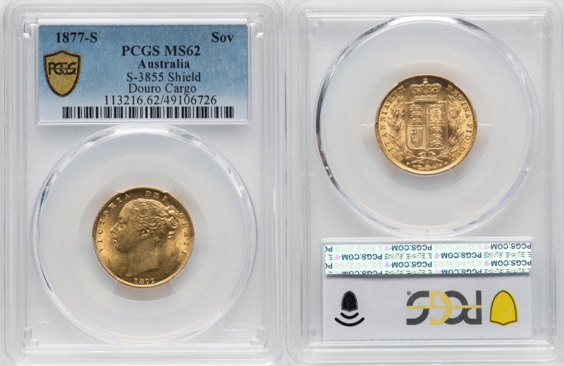 Australia: 1877-S gold “Shield” sovereign of Queen Victoria, from the RMS Duoro shipwreck PCGS MS62. Cert. #49106726. Numista-24198, Krause-Mishler-6, Friedberg-11, Spink-3855. .917 gold, .2355 oz. Diameter: 21.5 mm. Weight: 7.98 g. Mintage: 1,590,000. Ex-Heritage Auction 3118, Lot 30083, 15 August 2024. Prior provenance to the James D. Wolfensohn Collection of Australian sovereigns. This coin was struck at the Sydney mint in 1877 and was part of the cargo of the British Royal Mail steamship Douro, which sank in a nighttime collision with the Spanish ship Yrurac Bat off Cape Finisterre near the Spanish and Portuguese coast, on the evening of April 1, 1882. All of Duoro’s passengers and 32 of her crew were saved, but the captain and five of his officers- and the ship’s treasure of gold coins and bullion- sank with Douro in 1,500 feet of water. 53 people aboard the Spanish ship also perished when it too sank. The wreck was found in 1993 and salvage operations were completed by 1996. There were some 28,000 gold coins brought up from the Douro wreck. Most were gold sovereigns, but there were also some rare Brazilian and Portuguese coins. 146572