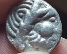 Its hard to say from the images, but here is an authentic example of your coin. What is the weight and measurement? EASTERN CELTS, DACHREITER TYPE AR Drachm OBVERSE: Celticized head of Zeus right REVERSE: Celticized horseman riding left; wheel of four spokes above Struck by the Skordoski in Syrmia, 2d Century BC 1.87g, 14mm OTA 188/2-3