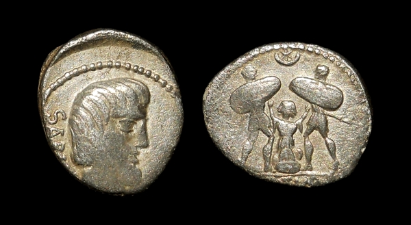 16.9g Bing, here's a coin up your alley. I only bought two RR's yesterday, this denarius and an uncia. This is L. Titurius L.f. Sabinus. For those of you unfamiliar with the type, the bust is Titus Tatius, and the reverse shows the killing of Tarpeia - a coin dripping with ancient Roman legend. So we've had the discussion of off-center strikes before - what is acceptable and what isn't, according to one collector or another. In the case of this coin, I answered that question with a yes please. For starters, the flan is oval and the obverse is struck too low, but the bust is full, and we can see how much room the die had around the dotted border - it created a lip at the top of the coin. The reverse is also struck too low, but what that means is that we are missing the inscription L TITVRI in exergue, but the scene itself is perfectly centered. So it's not the $200 version of the coin, but it had sufficiently enough character and quality to pique my interest. Looking at a dozen of so of these, it seems the flans were always too small for the dies, so you're always going to sacrifice something...