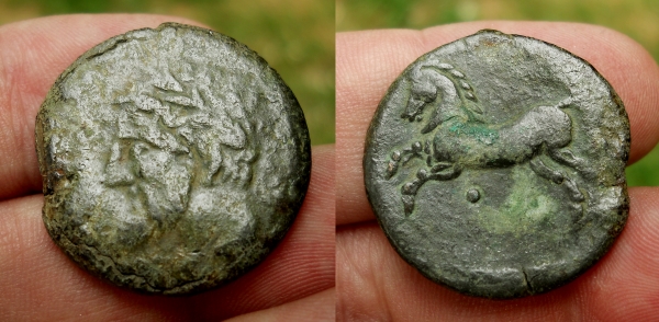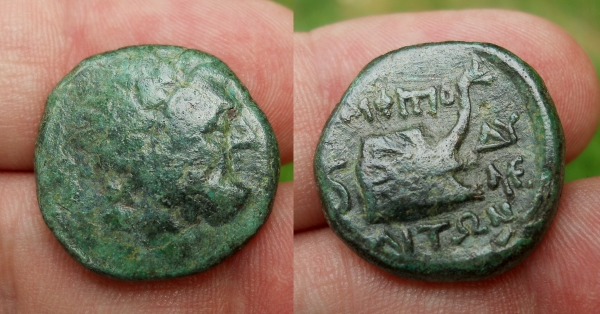Here is a bronze of Amphipolis during Roman Republic rule over Macedonia, 1st-century BC. Zeus obverse, with prow of galley on reverse. This coin is scarce, and I'll venture to say exceedingly rare in this condition, with full lettering and monograms on reverse. I've only seen a couple in my day, that didn't grade better than Good, if that...
