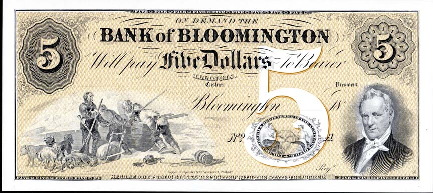 You might be able to date that Bloomington bank note to sometime around 1857-1861 as that is, I think, President James Buchanan. More likely 1857 or 1858 before the populace realized that his presidency was one of the more feckless ones that no bank wanted to be associated with.