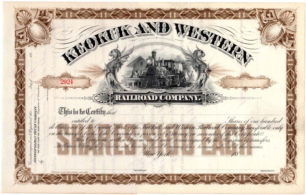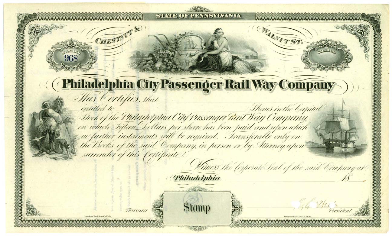 I finally acquired an item that I've been in search of for about a decade! And this helps tie together some of the elements posted above. A little explanation... A bank note company, after talking with client who was looking for a custom stock certificate or bond, would have a paste-up artist piece together a mock-up design from sections of borders, corner elements, vignettes and text. This way the client could review the design before starting the expensive process of creating an engraved steel printing plate. Years ago, I picked up one of these pasted-up designs on the cheap, before I really understood what it was. It was created in the mid-1960's for the Massachusetts Investors Growth Stock Fund, one of the first mutual funds in the U.S. These paste-ups are quite scarce and were never intended to end up in public hands. I believe most were probably destroyed once the stock or bond was finalized. I've been on the lookout for an actual stock certificate from the company since then and last week one finally surfaced on eBay in the form of a specimen. It's interesting to see the subtle differences between the paste-up and the specimen certificate. The paste-up shows the par value of $1 per share and is incorporated in Massachusetts. The specimen is 33-1/3¢ per share and is incorporated in Delaware. So there were some corporate changes made during this time. But the biggest puzzler is the bank note printer. The paste-up shows an imprint of American Bank Note Co., while specimen was printed by a small competitor, E.A. Wright Bank Note. So did the client take the paste-up somewhere else to have it done more cheaply? Or did the client bring a specimen to ABNCo and ask them to match the design? An interesting mystery that will require some further research.