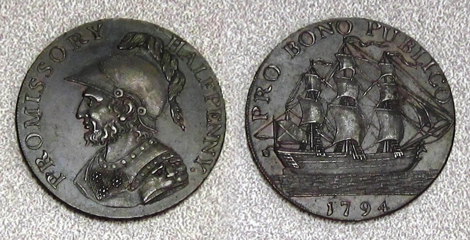 The second copper in this batch is a Conder Token. The obverse has the helmeted bust of Sir Bevois and the words PROMISSORY HALFPENNY. The reverse depicts a nice sailing ship and the words PRO BONO PUBLICO. There are a few sales for this token on the internet so it does appear to be a more common & popular piece. The story of Sir Bevois was supposedly told by minstrels and storytellers until the 17th century. I had not heard the story until now. According to the story, Sir Bevois, was sold to slave merchants by his mother. The legend describes his adventures and heroic deeds accompanied by his giant page Ascupart. He has a magic sword named Mortglay and a magical horse named Hirondelle. In the story, he falls in love with a Muslim princess named Josian and fights lions to defend her. He Returns to England to reclaim his father's land and founds the city of Southampton. This legendary tale is told on this BBC Website: http://news.bbc.co.uk/local/hampshi...s/arts_and_culture/newsid_8481000/8481274.stm