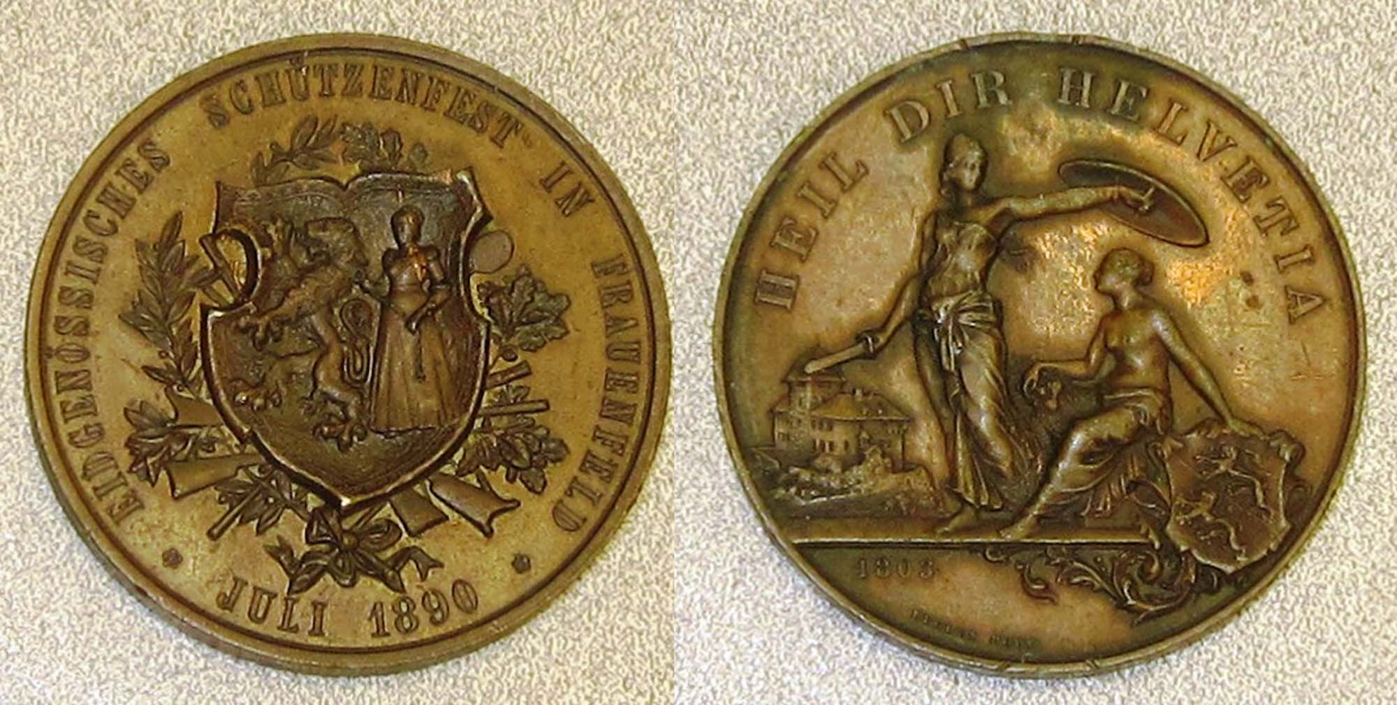 The third copper in the batch is a very high relief medal from Switzerland. It has the date July 1890. (I promise to take better care of this medal than did the previous owners). The obverse legend says EIDGENOSSISCHES SCHUTZENFEST IN FRAUENFELD and Juli 1890. In hand, it has the chocolate color of toned copper and not so bronze as depicted in my photo.