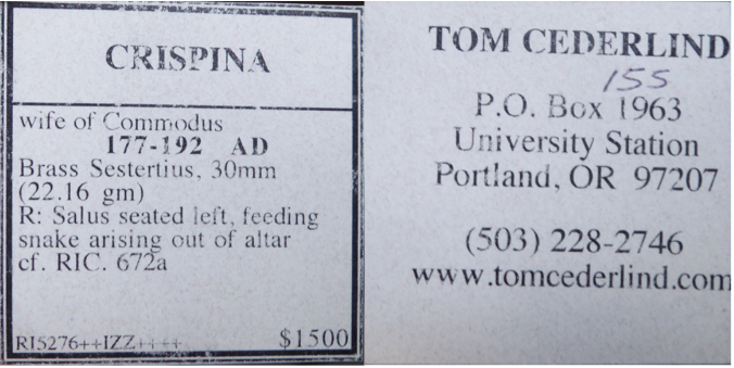 When Bruttia Crispina, the teenage daughter of twice Consul Gaius Bruttius Praesens and his wive Valeria, married the 16 year old Commodus in the summer of 178, she immediately received the title Augusta and thus became the sole empress of the Roman Empire, as the previous empress and wife of the Senior Emperor Marcus Aurelius, Faustina the Younger, had died three years before. It was Marcus himself who had arranged the marriage of his son to crispina, who was not only described as being a graceful person with a susceptible heart, but also brought a dowry of a large number of estates in Lucania. Crispina´s images fall into two portrait types. The first type, which we see here, comemorates her marrige to Commodus in 178 AD, whereas Crispina´s second type marks Commodus´s accession in AD 180. The hairstyle here is similar to that of Faustina minor in the 1st figurative type. In place of the loosely hanging hairline bows we see a heavy rolled plaid which is parted over the center of the forehead and surrounds the face. The plaits on the side of the head are four or five in number and are drawn up into a large bun which cobers much of the back of her head. The ears are left uncovered. Crispina´s forehead is straight, her eyes long and almond-shaped, her nose short, and her mouth small and full. A visual feature of her youthfulness is the uncovered neck. This coiffure is a precursor to the hair styles of the wife and daughter of Didius Julianus, Manlia Scantilla and Didia Clara, as well es the "helmet cuts" of Julia Domna and Plautilla. CRISPINA AVGVSTA - Draped bust of Crispina right. SALVS S C - Salus seated left, holding patera from which she feeds snake coiled around altar, resting arm on back of chair Sestertius, Rome, ca. AD 178-180 22,16 gr / 30 mm RIC (Commodus) 672a; Cohen 33; BMCRE (Commodus) 420; MIR 18, 16-6a; Sear 6010, Banti 14 (21 specimens) ex J. Alan Seeger Collection; CNG 76, 12.09.2007, lot 3330; ex Tom Cederlind Crispina did not seem to have any significant political influence over her husband during his bizarre reign. Her marriage failed to produce an heir due to her husband's inability, which led to a dynastic succession crisis. Crispina was falsely charged with adultry by her husband and was banished to the island of Capri, where she executed in 192, only months before the murder of Commodus. Her downfall was not connected to that of Lucilla as was once thought. The proportion of the coinage struck for the empress fell significantly under Commodus, so Sestertii of Crispina are surprisingly scarce as compared to the other Antonine empresses. This Sestertius´ previous owner, Dr. John Alan Seeger (1929-2010), was a member of the American Numismatic Society for almost 60 years and started assembling his collection in the late 1940s. My Crispina later went through the hands of dealer Thomas Bentley Cederlind (1959-2015), whose ticket came with it: Please post your Crispinas, theories about the dating her coins, or any extra info you might have about my coin´s provenance.