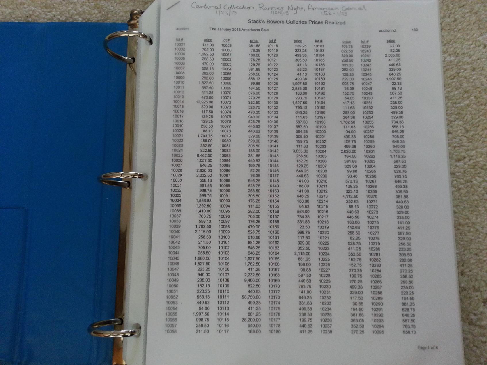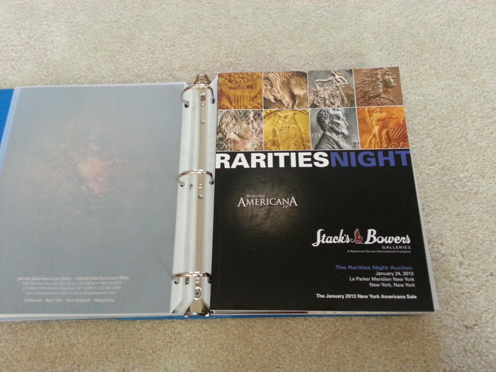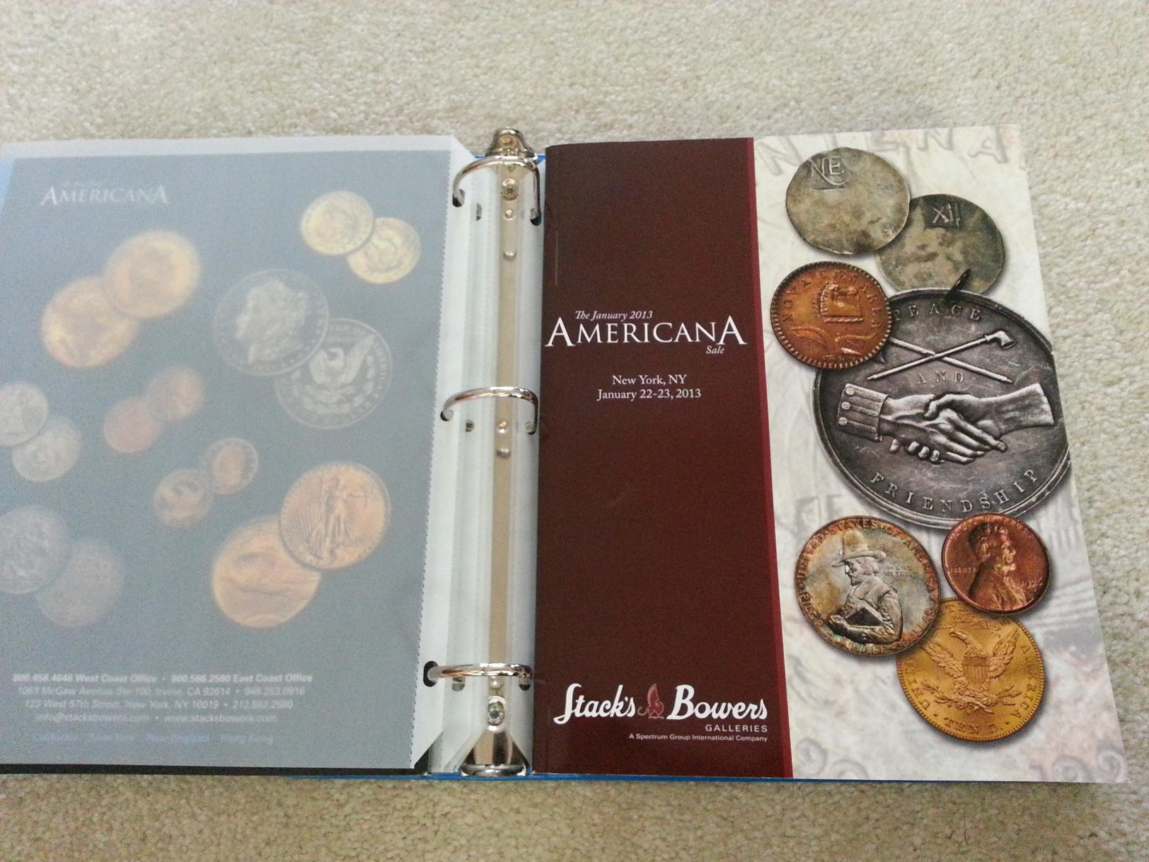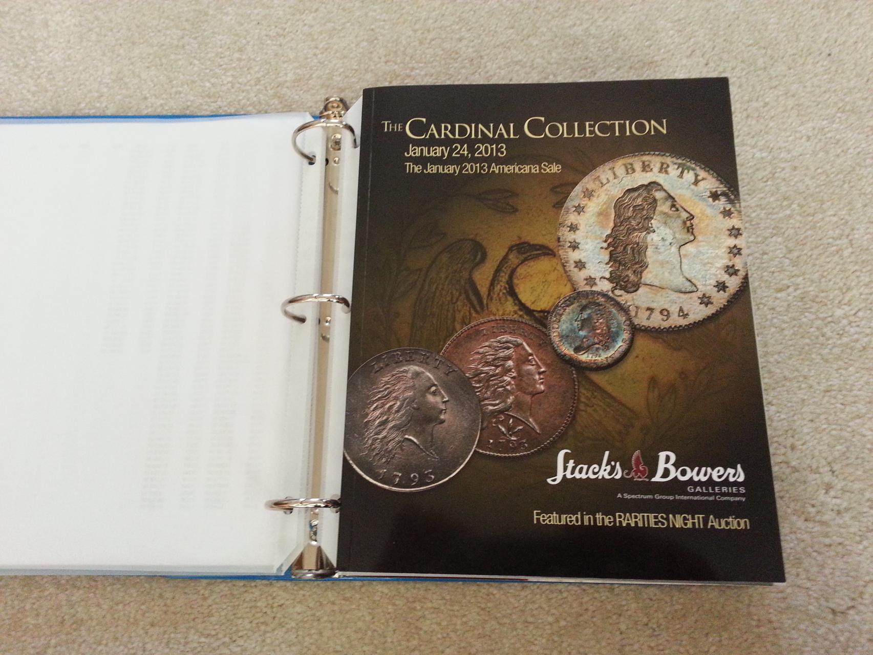 Big thanks to Stacks & Bowers who were kind enough to mail me all three auction catalogs for their recent NYC sale of the Cardinal Collection, Rarities Night, and the Americana Sale. To any budding numismatists I highly suggest requesting theseccatalogs, as they are both full of beautiful pictures but priceless information and provenance. Plus S&B was kind enough to send me all 3 catalogs at no cost (they even paid the $10.35 shipping cost, these puppies are heavy). FYI: they will happily send you your first catalogs for free, but to receive all the catalogs for all the year's auctions is something like $400. Anyway, I put the catalogs in a binder and printed off the lot sale's prices for future reference. The pdf file showing pirces paid for the various lot#(s) can be found on Stacksbowers.com