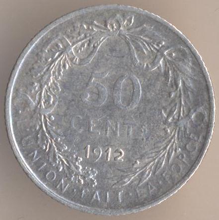 King Albert I (1909-1934). 50 centimes 1912, silver .835, weight - 2,5 g., size - 18 mm, mintage - 1000000 pcs. Engraver Godefroid Devreese Belgian sculptor and medalist). A coins of this type were released at 1910-1912 and 1914. Demonetized at July 30 1932.