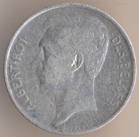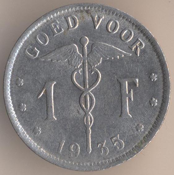 King Albert I. 1 franc 1935, nickel, weight - 5 g., size - 23 mm, thickness - 1,7 mm, mintage - 2238000 pcs. Engraver: Armand Bonnetain. Legend on Dutch. Coins of this type were released at 1922-23, 1928-39 and 1933-35. Demonetized at January 24 1949.