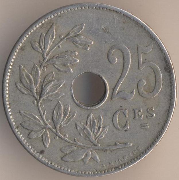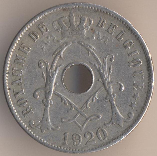 King Albert I. 25 centimes 1920, copper-nickel, weight - 6,5 g., size - 26 mm, thickness - 1,78 mm, mintage - 2844000 pcs. Engraver: Alphonse Michaux. Legend on French. Coins of this type were released at 1913, 1920-23 and 1926-29. Demonetized at January 30 1967.