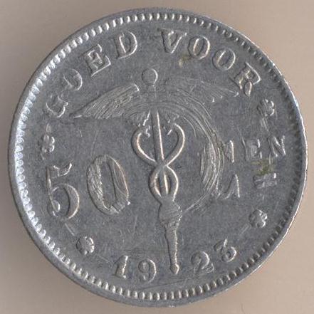 King Albert I. 50 centimes 1923, nickel, weight - 2,5 g., size - 18 mm, thickness - 1,45 mm, mintage - 15000000 pcs. Engraver: Armand Bonnetain. Legend on Dutch. Coins of this type were released at 1922-23, 1928, 1930 and 1932-34. Demonetized at May 8 1953.