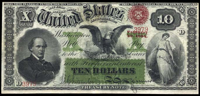 Me, too! Looks great, imho. Much better than some of the previous years. I believe that the top two vignettes were printed from the original plates; the large one below looks like it was enlarged from a smaller version. And hey, Mike, check the information card that comes with it -- the top left IS an ABNC vignette! It appeared on two $10 Interest Bearing Notes from the 1860s, when the Treasury was still contracting with private bank note companies to print U.S. currency. I'll post an example (not in my personal collection, except in my dreams). ABNC ultimately had to turn over the plates for all the federal securities they printed -- it's pretty cool to know they're still in the BEP vault after 150 years.