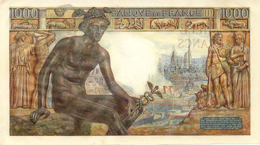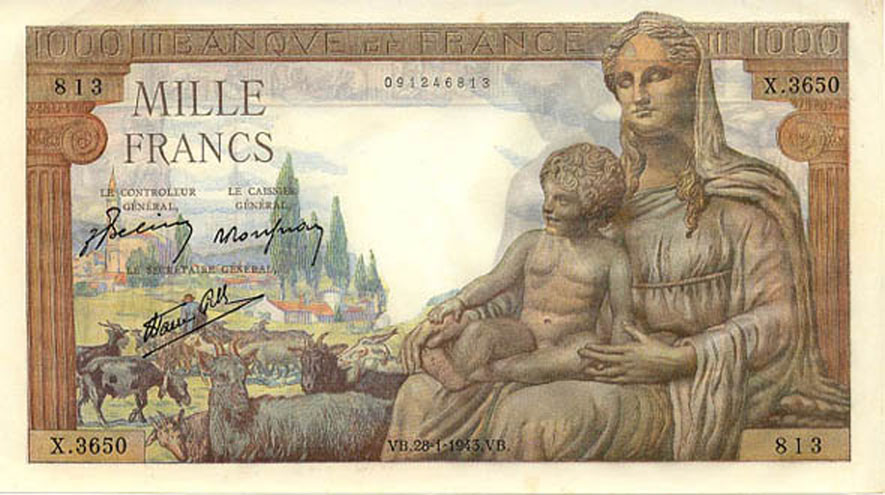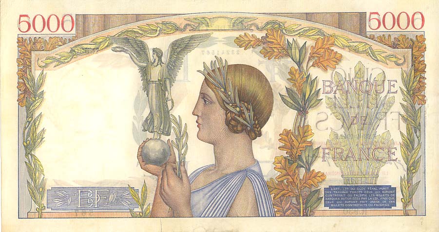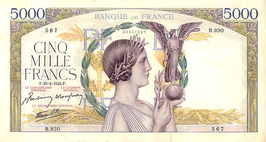 I enjoy old French banknotes....these are in my collection. 1,000 Francs Demeter - 1943 - Vichy Republic 5,000 Francs Victoire - 1942 petronius :smile