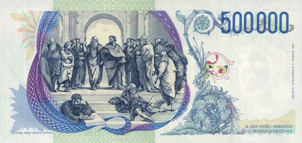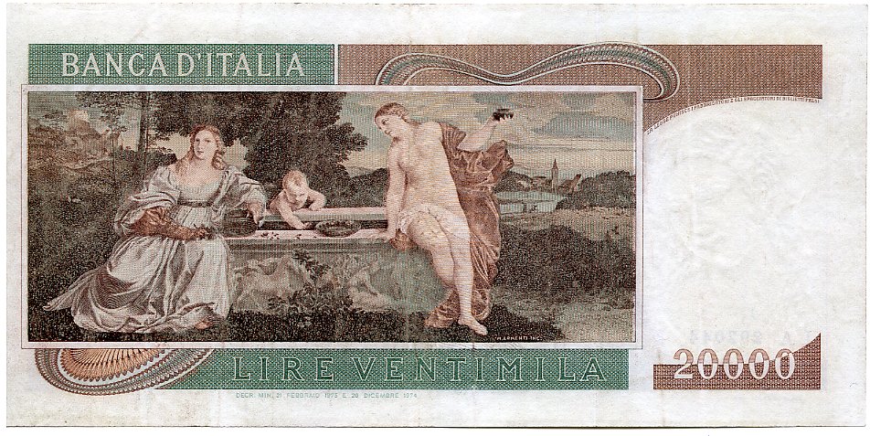 ....but, at last, I'm still Italian Art of Italian Renaissance on banknotes 20,000 Lire - Tiziano - Amor sacro e Amor profano (original painting at Galleria Borghese - Rome) 100,000 Lire - Caravaggio - Canestra di frutta (original painting at Pinacoteca Ambrosiana - Milan) 500,000 Lire - Raffaello - La Scuola di Atene (original painting at Palazzi Apostolici - Vatican State, Rome) petronius
