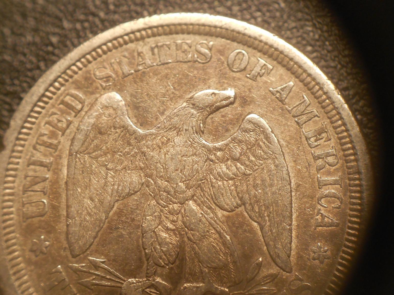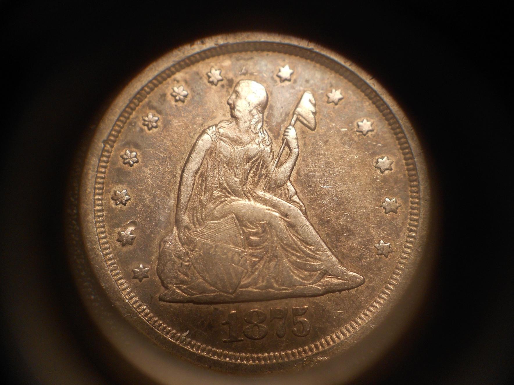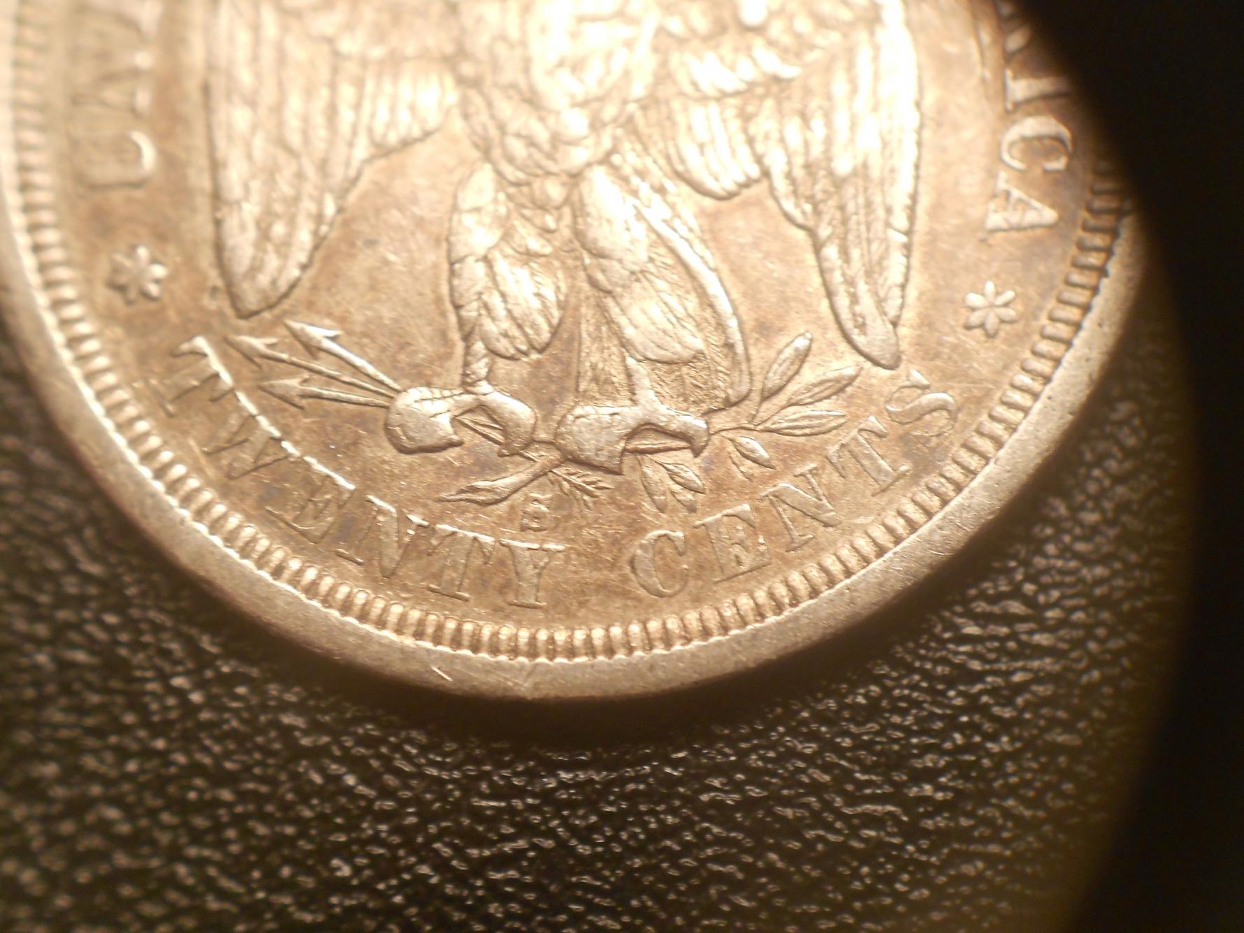 Ever since I started collecting one of my favorite coins has been the 20 cent piece. I don't know much about the different varieties and such but I thought they were a very very cool piece of American history. I have wanted one in my collection forever but the price was well out of my reach (and still is). Fortunately though, I have one of the best girlfriends ever. I had a hunch she was giving me a coin for Christmas but I didn't know what one. She wrapped it inside 6 boxes with the largest one being one I could pretty much fit inside and she weighted it down with bottles of water. Needless to say I was quite confused as to what I had gotten until I got to the very inside and unwrapped the box to find this beauty inside. Sorry for the horrid pics, my camera is terrible except from far distances and really close ones. Also, anybody who knows a site with pics of varieties, let me know. :)