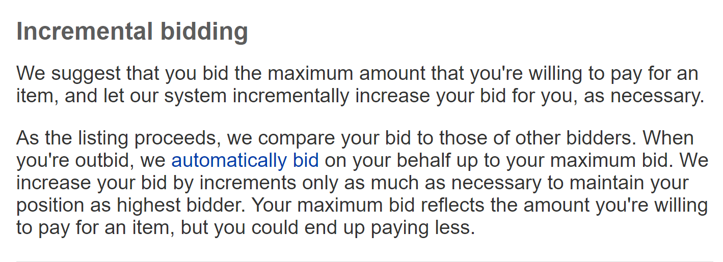 There are exceptions though. If it's a homogeneous product with many, many items already available, then it's best to bid the competitive price at the very beginning. Even though you could just Buy It Now at a competitive price for homogeneous goods, you have a chance at paying less than the Buy It Now price. You bid early instead of last second because the price is practically guaranteed to reach the competitive price, and the first buyer to bid that price wins. So for instance, if there are thousands of a given year's proof sets up for sale, there will be a competitive price. In that case, your maximum bid is the competitive price. If say, the proof sets are sold at $10, other buyers see the auction price and see that they sold for $10 and are available for $10 from other sellers now. Buyers will want to buy it for less so they have every incentive to bid up to $10. If they bid incrementally and it gets up to $9.50, the next bid amount will be $10 and there's no longer as luring an incentive to bid $10 (though some do), and they'll evacuate to another auction of the same item but at a cheaper current bid price. With rare coins or numismatics in general, this situation applies less in my opinion.