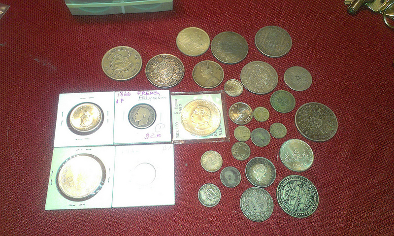 I just finished tallying up the silver content - it's approximately 9.42 oz ASW. From my excel sheet (last column is an approximate grade): Italy (Sardinia) 1828 50 centesimi 12 India 1886 1 Rupee 30 Germany - Prussia 1900 5 Marks 20 Belgium 1870 5 Francs 40 Spain 1871 5 Pesetas 16 Austria 1900 5 Corona 20 Mexico 1872 1825 to 1872 type (dateless due to wear) 2 Reales 3 Switzerland 1920 2 Francs 20 Switzerland 1940 1/2 Franc 40 Cuba 1934 1 Peso 20 Italy 1965 500 Lire 61 Czechoslovakia 1933 20 Korun 61 Brazil 1913 1000 Reis nice toning 55 Mexico 1926 10 Centavos 40 Mexico 1933 10 Centavos nice toning 40 Mexico 1927 10 Centavos 16 Mexico 1942 10 Centavos 65 Mexico 1942 20 Centavos 40 Mexico 1942 20 Centavos 16 Germany 1847 3 Kreuzer 8 Sweden 1852 1/15 Riksdaler Specie 12 Japan 1964 100 Yen 65 Japan 1964 1000 Yen 64 Brazil 1888 2000 Reis 30 US Philippines 1944 small H (?) 50 Centavos 63 France 1866 1 Franc 8 Mexico 1957 5 Peso 64 Turkey 1901 unknown date (1901-1910?) 5 Kurush 12 Unknown - looks like a Moroccan style 1890?